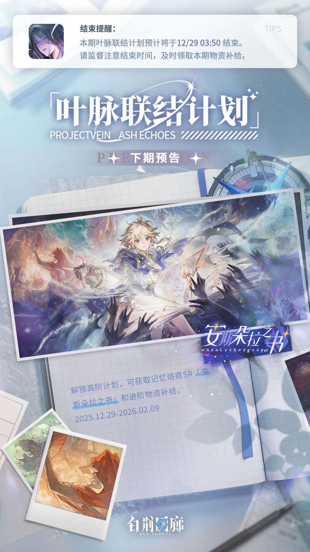 本期叶脉联结计划预计将于12/29 03:50结束。请监督注意结束时间,及时领取本期物资补给。▶下期预告※ 安斯朵拉之书※ 12/29 04:00 - 02/09 03:50#白荆回廊