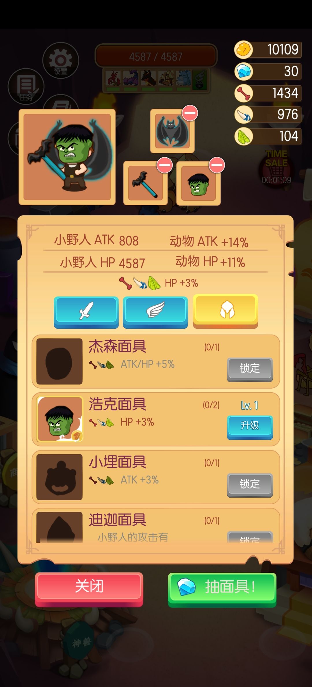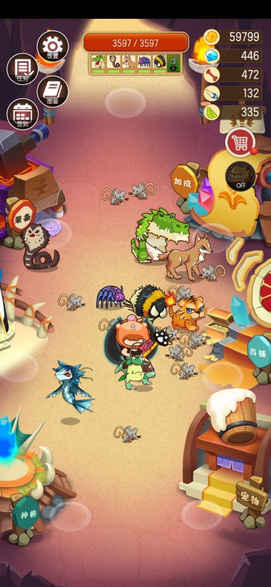 这个队伍一共有几类养成 一,神兽 可复活,钻石升级,免费的是看两天广告活得的火焰虎,属性还不错,算前期主力 二,培养动物 靠杀野生动物获取及升级,每种只能召一只,可无限复活,算是同期主力,意思就是遇到同类能打,遇到强力动物就跪,毕竟比同期野生动物多了几级 三,野生动物 固定一级,不能复活需要捕捉,抓一堆,然后单车博轿车,意思就是带一群围殴厉害一点的动物,然后阵容的实力就慢慢提升了 四,人物(小野人