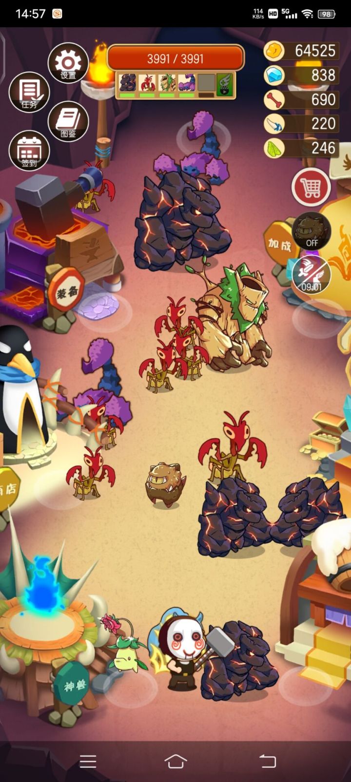 有钻石就开格子,增加带动物的上限,有余裕就用SL大法刷个探宝面具。仅快探索完岛1,才能打与买螳螂,带25只螳螂去打老虎和猛玛就可通关。