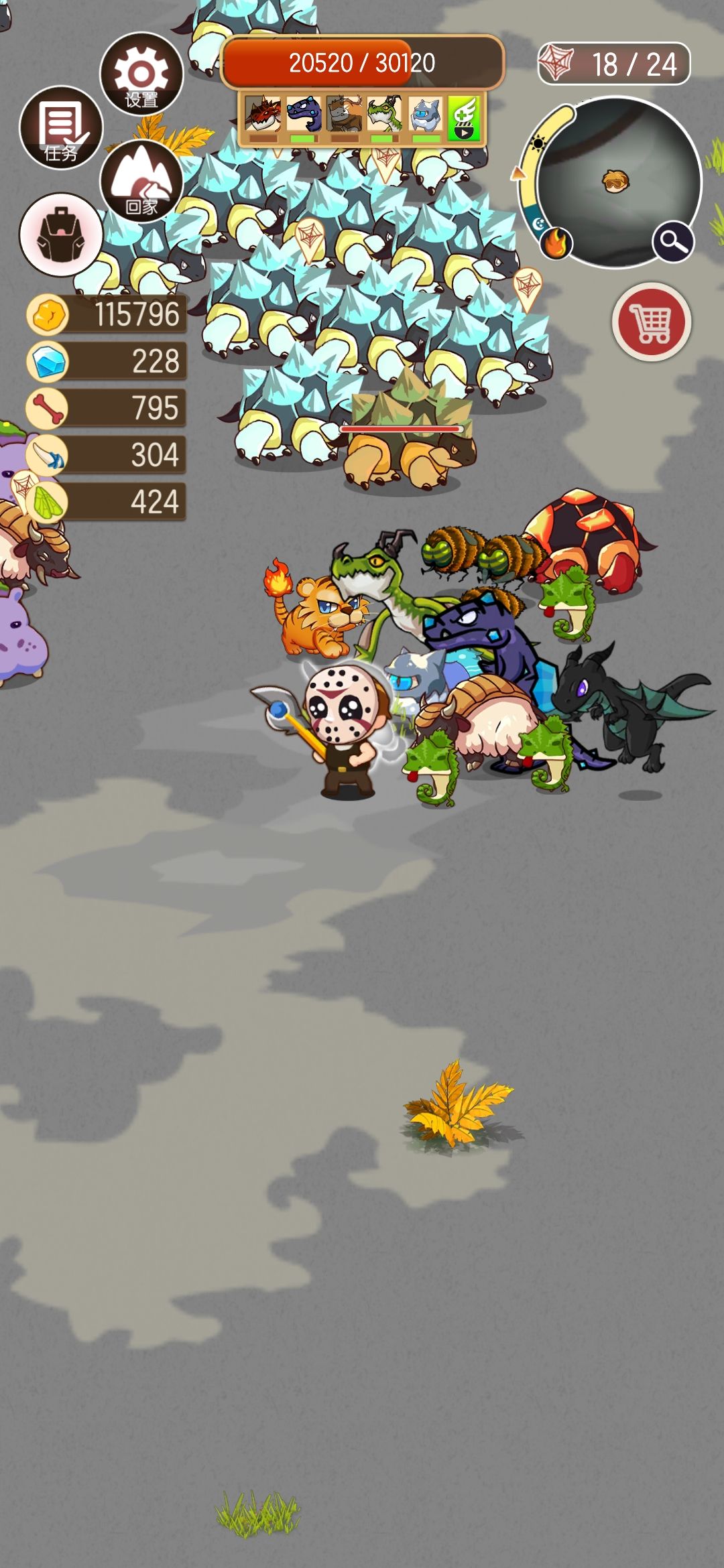 携带的三个英雄级我没有刻意刷,上图也可以看到都还是一级的,出门我带的都是三图boss巨龙,只有这个可以买,血量在后期确实不优秀,好在攻击力高且可释放技能。觉得乏力的,把小地鼠自动获取素材卸下来,抓图里的野怪维持。游戏的核心玩法就是以弱胜强