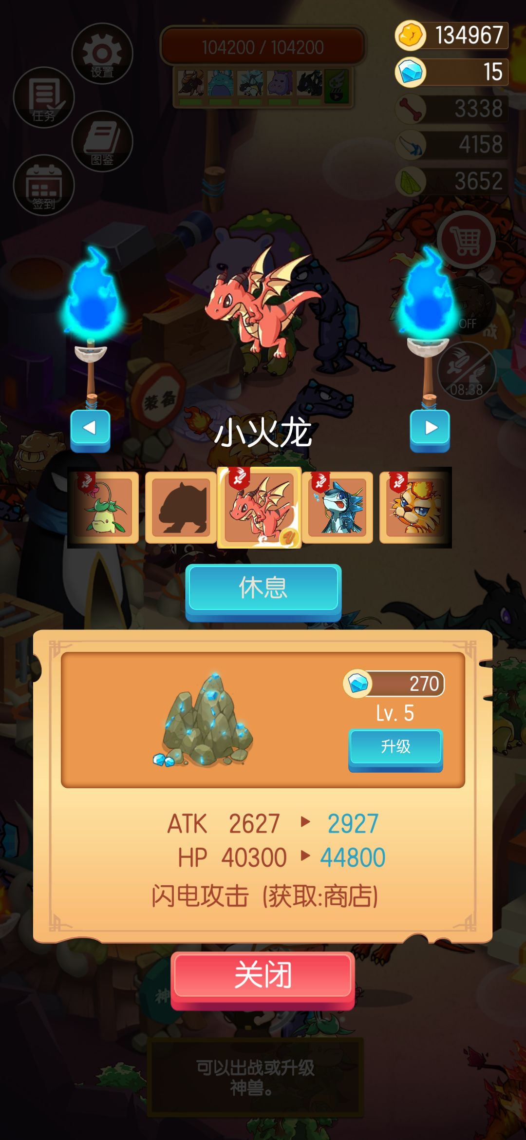 说实话,这游戏要么猛肝,要么氪金,不氪金买个鱼你是不可能打得过第二关之后的boss的,所以就当娱乐玩玩前三关就行了,第三关的龙就放弃吧,太难了。尽快更新吧 前期会遇见被困住的野兽,强烈推荐看30秒视频然后获得,都是开荒神兽,前期具有用滴,啊
