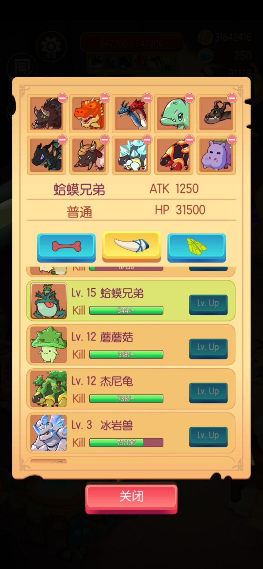 这个队伍一共有几类养成 一,神兽 可复活,钻石升级,免费的是看两天广告活得的火焰虎,属性还不错,算前期主力 二,培养动物 靠杀野生动物获取及升级,每种只能召一只,可无限复活,算是同期主力,意思就是遇到同类能打,遇到强力动物就跪,毕竟比同期野生动物多了几级