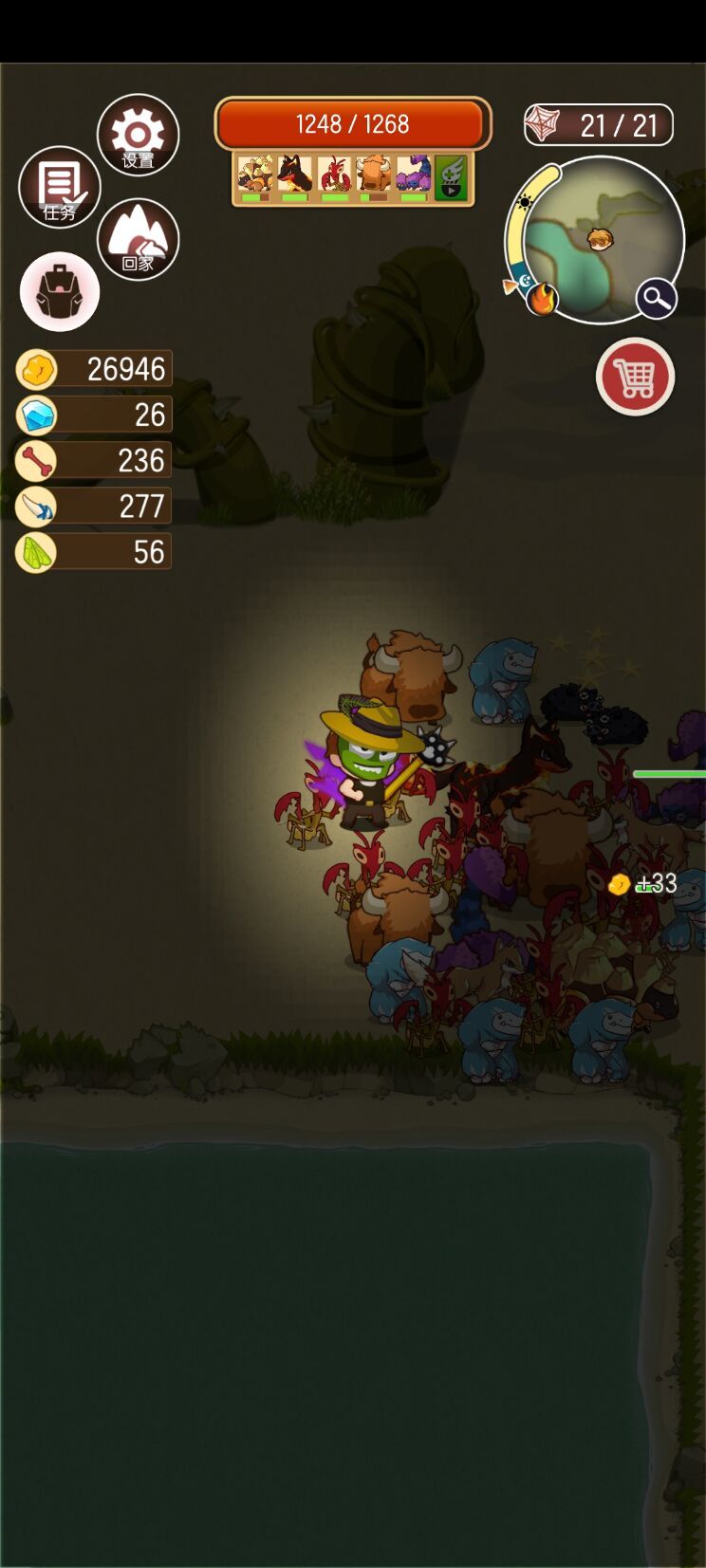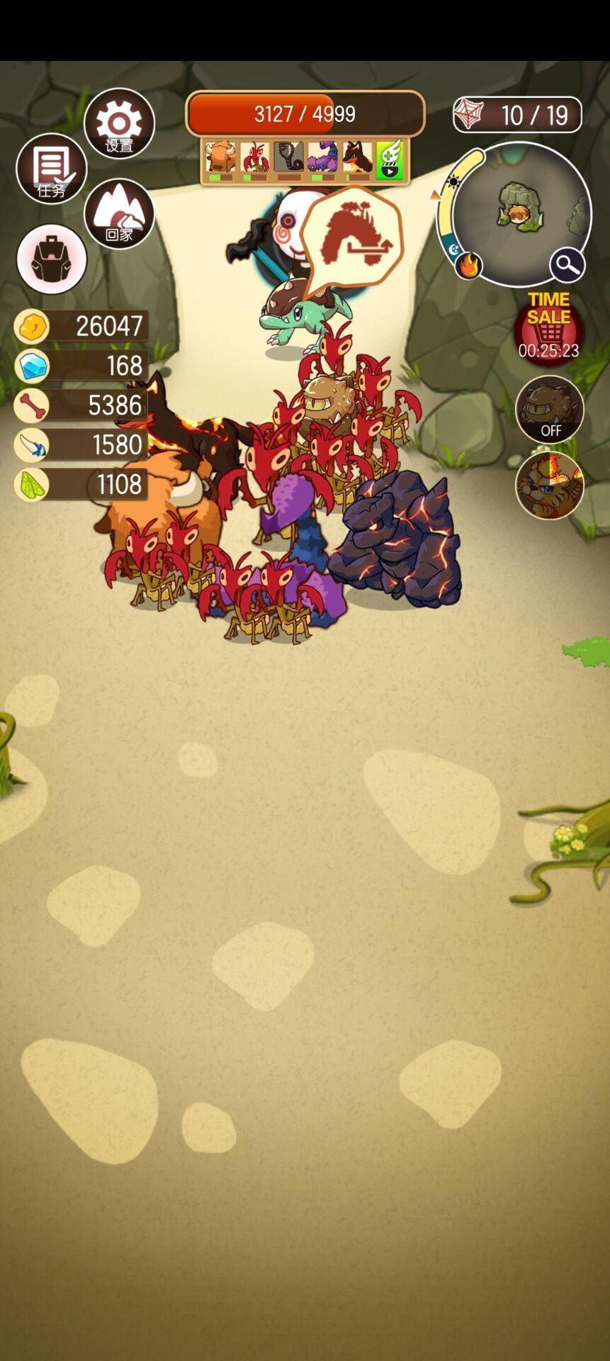 有钻石就开格子,增加带动物的上限,有余裕就刷个探宝面具。仅快探索完岛1,才能打与买螳螂,带25只螳螂去打老虎和猛玛就可通关。