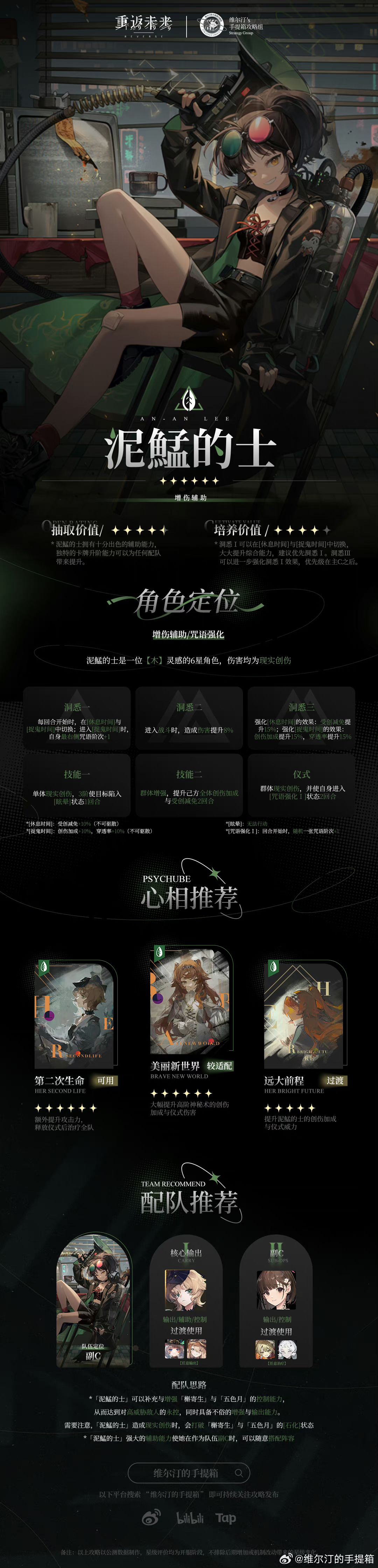 ▍泥鯭的士是木属性现实创伤型副C角色,拥有十分出色的辅助能力,独特的卡牌升阶能力使她能够灵活搭配队伍,在任何队伍中都有着出色的表现。 ▍泥鯭的士整体培养优先级较高,洞悉Ⅰ后每回合可在[休息时间]与[捉鬼时间]中切换,大大提升综合能力,而洞悉Ⅲ可以进一步强化洞悉Ⅰ效果,整体养成收益较为不错。 ▍角色一图流: 角色一图流内容包括:角色评级、配队思路及推荐、心相推荐、认真看完一图流,各位司辰们就可以对泥