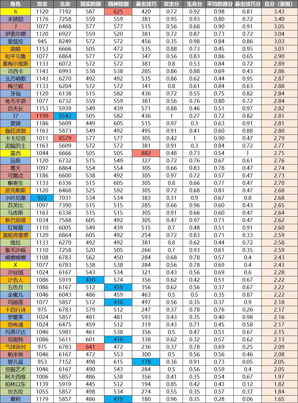 在《重返未来1999》中面板数据也是衡量一个角色在不同场合的是否存在优势;而大部分5星为了抑制强度惨遭面板下毒,而有个5星的综合面板却超越大部分6星,但其泛用性下毒严重。面板计算以某项数值最高者和最低者定界(各角色数据为洞三60级无共鸣无心相),按0-1进行排序赋分(双防分取平均分)。 综合面板: 让我们恭喜6依然是综合面板第一 6不仅综合面板强力,自身也是有着较高的泛用性,是4人本的优选角色,尤