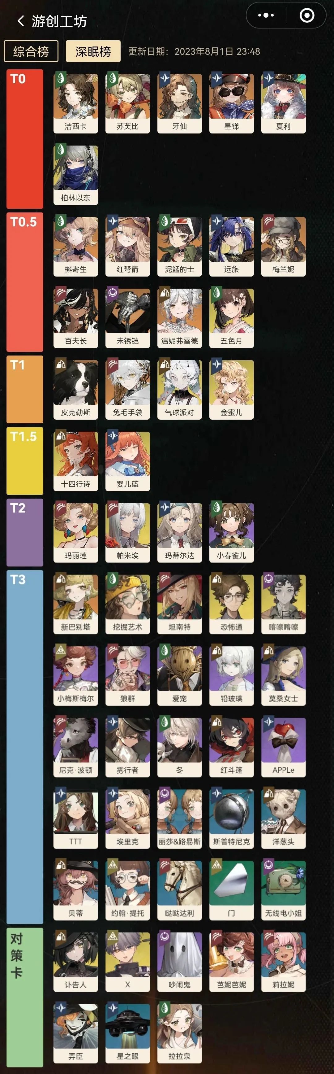 (本期通用buff) 最新的角色节奏榜单请前往小程序查看 T0: 洁西卡(下半克制,深眠buff,关卡buff全吃,无苏也能乱杀下半,对群环境十分合适) 苏芙比(下半最佳奶妈,克制,深眠buff,关卡buff都吃得到,用好毒,让所有人享受深眠buff加成) 牙仙(上半最佳奶妈,吃到克制加成,深眠buff,大招伤害十分高,奶量也不错,16关可以一次上2回合明昧对星锑,夏利收益很高) 星锑(与牙仙和