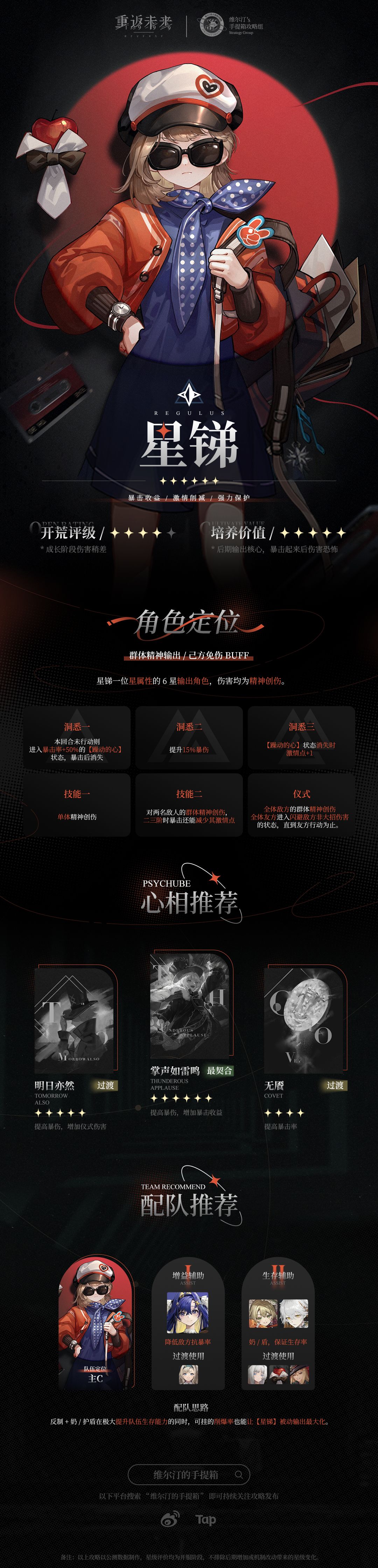 ▍这是一位星系输出角色她的神秘术能对敌方造成精神创伤,并在暴击时,扣除敌方一定量的激情;至终的仪式能对敌方全体造成精神创伤,并为已方全体增加特殊BUFF,在未行动前闪避所有非至终仪式的创伤。 ▍总体来看,星锑是一名偏向技巧型的输出主C,高额的暴击率能为她带来可观的收益,而大招的机制也为队伍带来了更多可能性,这也使得星锑在合理组队后可以达到非常优秀的综合能力。 ▍角色一图流: 角色一图流内容包括:角