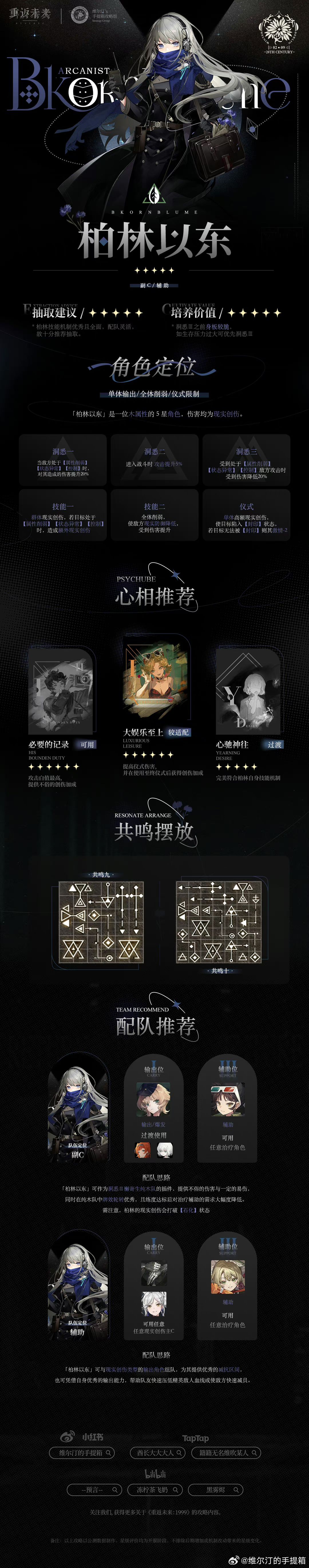 ▍柏林以东是木属性现实创伤型副C角色。自身技能组非常优秀,基本神秘术能提供现实防御削减与易伤,至终仪式能限制敌人的大招,自身又拥有对附带减益状态敌人的增伤,能在提供相当优秀的伤害的同时,辅助现实创伤的队友,是一名非常出色的副C角色。 ▍整体来看,柏林以东集增伤、减伤、削抗、易伤、封印于一体,机制优秀且全面,能有效提高队伍输出上限。但在洞悉Ⅲ之前生存属性较差,若实战中生存压力大,可以优先将其培养至洞