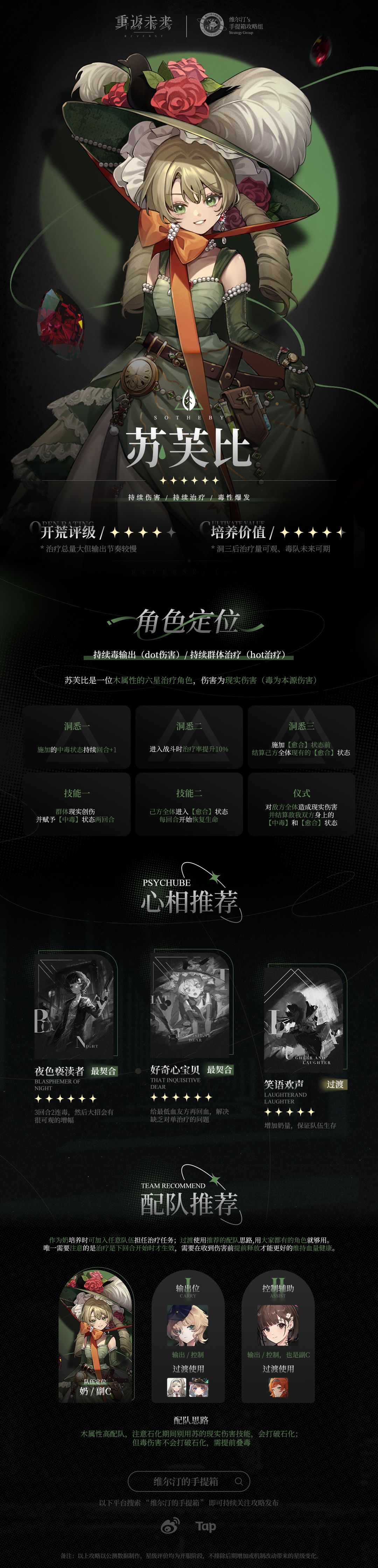 *目前同名微信交流群正在持续招人中,有需要的小伙伴请在评论区戳戳* 这是一位木系输出辅助角色。她的神秘术能为已方全体添加一定回合的[愈合]状态,并对敌方附加[中毒]状态;至终的仪式能对敌方全体造成现实创伤,并立即结算当前场上所有[中毒]和[愈合]状态 整体来看,苏芙比是一名偏向叠毒爆发的输出辅c,洞3后能为队伍带来非常优秀的持续回复,而作为毒队核心的她来说也能为队伍带来了更多可能性,这也使得星锑在