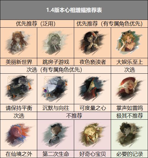 写在开头: 该篇攻略旨在为大家的心相换取提供建议,由于目前并没有足够的实战测试,如果选择困难,可以先等一段时间再考虑兑换 (或者直接给喜欢的角色换一个就好,慢慢玩全都会有,不必过度焦虑) 此外,建议优先换取主c适配的心相,再考虑其他 进行更多测试后可能会对内容进行修改 [夜色亵渎者推荐程度已修改,经测试温妮先出伤害再上重伤,该次攻击吃不到加伤(策划何意啊?)] [夜色亵渎者推荐程度再次修改,不愧