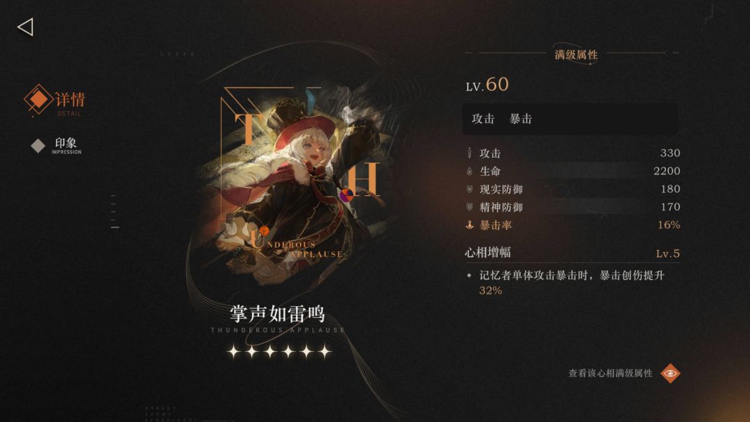 今日签到送6星心相,后天资源本无缺的话也能换第二个6星心相了。今天分享下我力推的几个心相选择 1.掌声如雷鸣(打单C位通用最强) 常规的暴击爆伤,高额的加成,就是限制在打单C位有点不友好 2.明日亦然(对你没看错是的5星心相) 终极技能输出型主C可换,个人觉得14非常契合 3.午后小憩(是的还是5星) 掌声如雷鸣低配版,多个选择多个C位 4.有苏玩家可以选择 弥补了苏没有3洞前没有及时奶的窘境,在