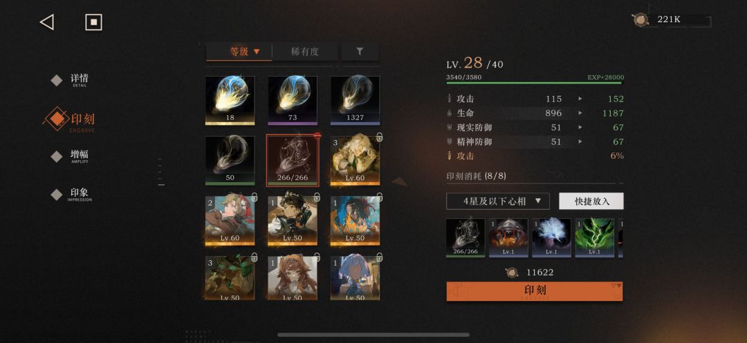 心相印刻 快捷放入 心相印刻快捷放入的逻辑是不是有点怪。 目前看来是先填充稀有度较低的材料,然后往高了填充,但这样会导致明明有经验值更高的材料,但一次快捷放入口甚至不能升到该阶段满级【如图一】;有时候甚至会浪费低级材料的经验值(先填充低级,导致后填充高级材料时经验值溢出,溢出的部分甚至可以cover掉低级材料所提供的经验)【如图二三】。 而且心相印刻这里材料填充操作往往需要多次,而现在手动填充材料