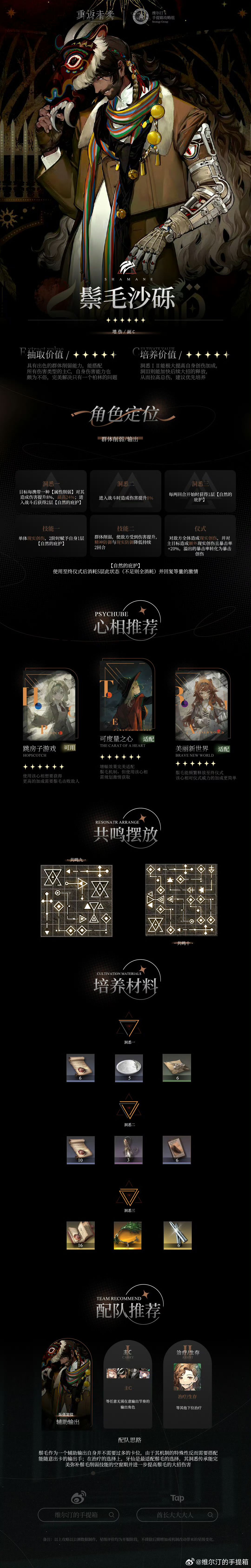 ▍鬃毛沙砾是一名兽灵感现实创伤型辅助输出角色,具有全面的减抗能力且能依靠自身机制快速获取激情,频繁释放至终仪式从而打出不俗的总伤。 ▍鬃毛沙砾培养优先级较高,洞悉Ⅰ后在面对具有【属性削弱】状态的敌人时能获得高额的创伤加成,开局自带2层【自然的庇护】更容易获得专属心相的强化效果也能加快自身回转。洞悉Ⅲ可以进一步强化回转能力,整体养成收益较高。 ▍角色一图流: 角色一图流内容包括:角色评级、心相推荐、