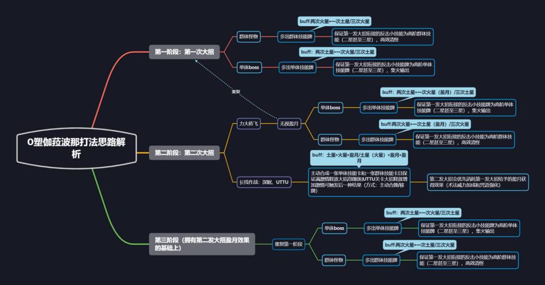 [表情_草]这塑造,只能说和之前预测有点出路,但是打法思路和之前差不多,要临时改一下思维导图了,我月卡党反正是最多抽1塑,因为可以稳定的触发2倍盈月就够了。 =========== 0塑的打法和之前预测的差不多,能理解0塑的打法后,1塑和2塑也能顺着思路打出来;但是有需要的话,我尝试做一下1塑和2塑图,今天秋招刚笔试完,先摸一下鱼。[表情_死机][表情_点赞] 原链接:伽菈波那打法个人解析(增加了
