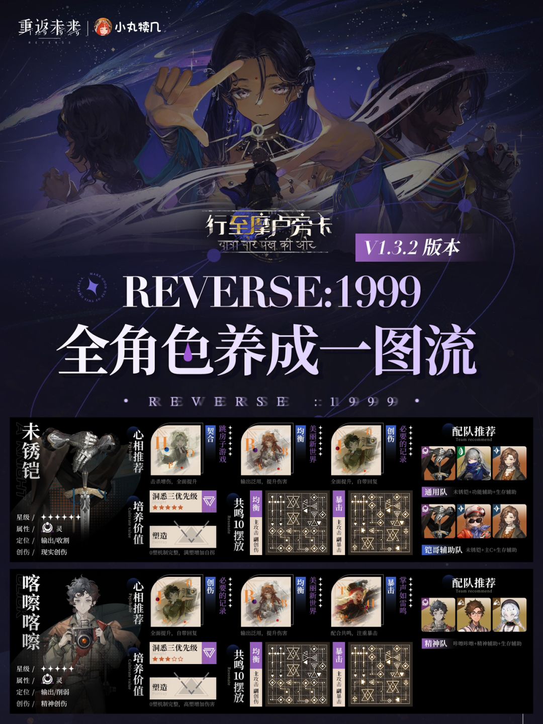 V1.3更新|重返未来1999『5/6星全角色一图流』养成攻略 将将,这里是小丸~本期给大家带来了船新版本,优化后的全角色一图流攻略<重返未来1999 V1.3版本行至摩卢旁卡>『5/6星全角色一图流』养成攻略 —————————————————— 一图流V1.3.2版本『更新内容』: 【角色部分】 1.新增V1.3新角色:鬃毛沙砾/坎吉拉/伽菈波那。 【心相部分】 1.更加清晰地注明定位:输出/