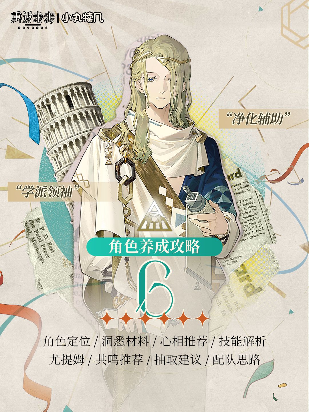①前言:6是一名智属性精神创伤的辅助角色,兼顾一定输出能力。强大的辅助功能是他的优点,灵光获取太慢和不搭配debuff/buff队友减益集合/增益集合过于随机是他的缺点,但是作为辅助或功能性副C来说,是非常合格的,初始300的暴击技巧也让他具有不低的伤害。 抽取价值:⭐⭐⭐⭐⭐(智属性唯一六星,且功能性强大,强烈建议抽取) 培养价值:⭐⭐⭐⭐⭐(解锁传承三后辅助强度非常高,建议培养到洞悉三) ②传