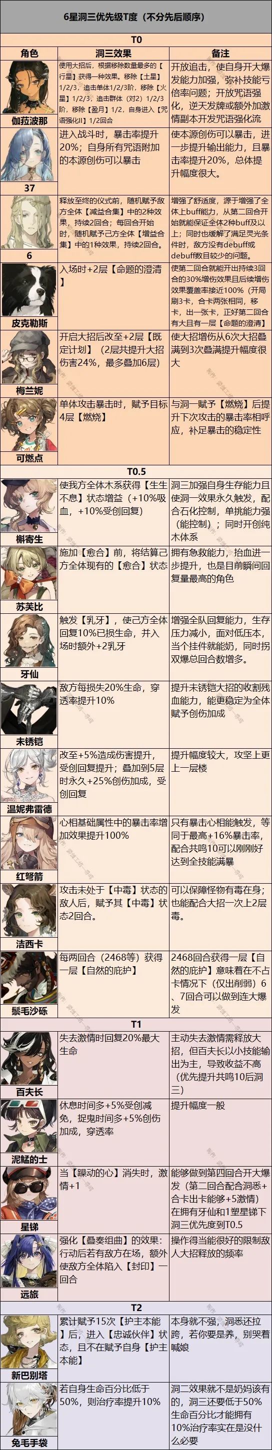 一上号,发现自己好欧,有好多洞二角色该优先洞三谁?这篇文章告诉你答案 T0: 伽菈波那:开放追击,使自身开大爆发能力加强,弥补技能亏倍率问题;开放咒语强化,逆天发牌或额外加激情副本开发咒语强化流 37:使本源创伤可以暴击,进一步提升输出能力,且暴击率提升20%,总体提升幅度很大 6:增强了舒适度,源于增强了全体上buff能力,从第二回合开始就能保证全体2种buff及以上;同时也缓解了满足灵光条件时