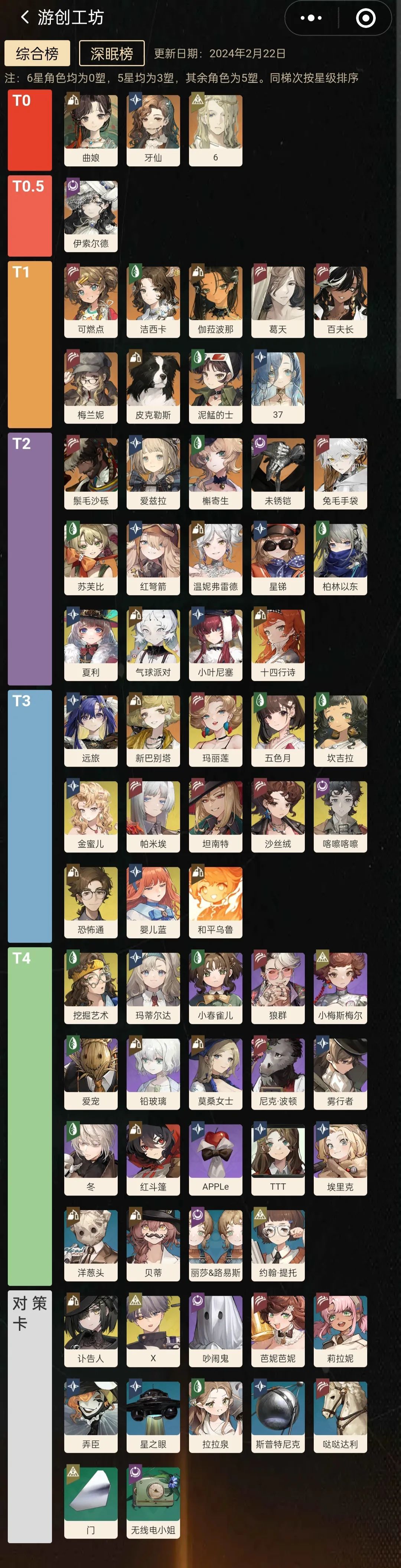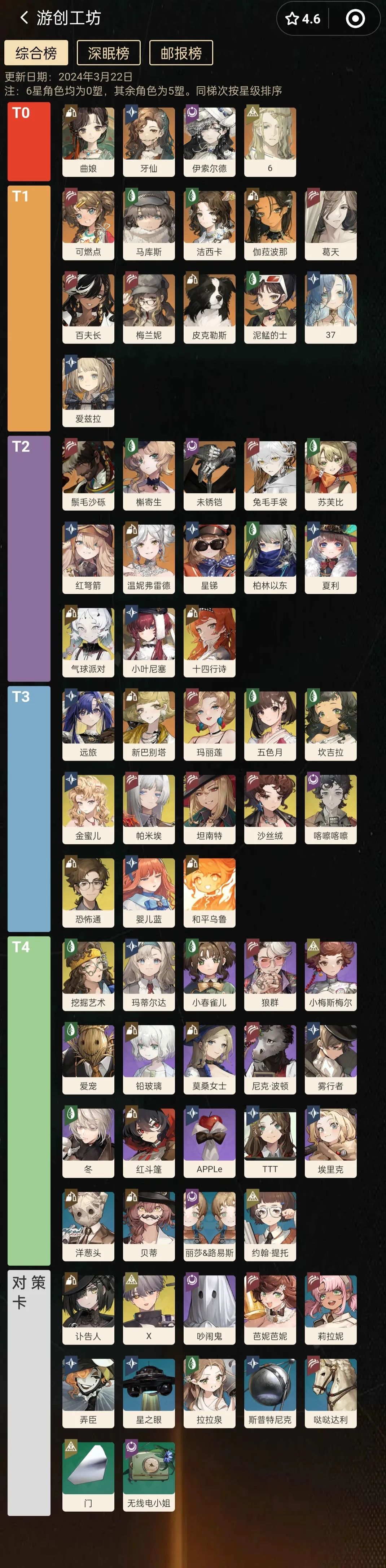 以开服至今在各种场合的表现与对未来保值性进行综合评定。(6星均为0塑、5星均为3塑,其余均为满塑,同梯次按星级排序) T0: 曲娘(技能倍率全面超模,自动调整倍率的大招使得自己对单对群无压力,输出面板足够优秀,还有目前的新时代国家队369牙/139牙) 牙仙(目前绝大部分组队的最适合的奶位,泛用性极高) 伊索尔德(现实通用拐,辅助能力强的同时还是输出型的偏挂机位,也是长线副本的神) 6(万能辅助