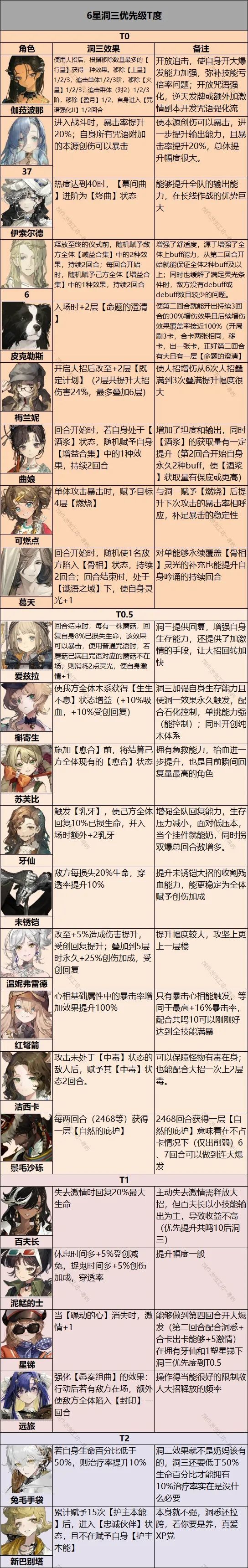 以开服至今在各种场合的表现与对未来保值性进行综合评定。(6星均为0塑、5星均为3塑,其余均为满塑,同梯次按星级排序) T0: 曲娘(技能倍率全面超模,自动调整倍率的大招使得自己对单对群无压力,输出面板足够优秀,还有目前的新时代国家队369牙) 牙仙(目前绝大部分组队的最适合的奶位,泛用性极高) 6(万能辅助,小技能净化仅此一人,副本第四人优选 T0.5: 伊索尔德(现实通用拐,辅助能力强的同时还是