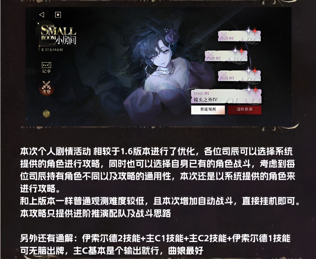 本次个人剧情活动 相较于1.6版本进行了优化,各位司辰可以选择系统 提供的角色进行攻略,同时也可以选择自身已有的角色战斗,考虑到每 位司辰持有角色不同以及攻略的通用性,本次还是以系统提供的角色来 进行攻略。 和上版本一样普通观测难度较低,且本次增加自动战斗,直接挂机即可。 本攻略只提供进阶推演配队及战斗思路 另外提供通解:伊索尔德2技能+主C1技能+主C2技能+伊索尔德1技能 可无脑出牌,主C基本