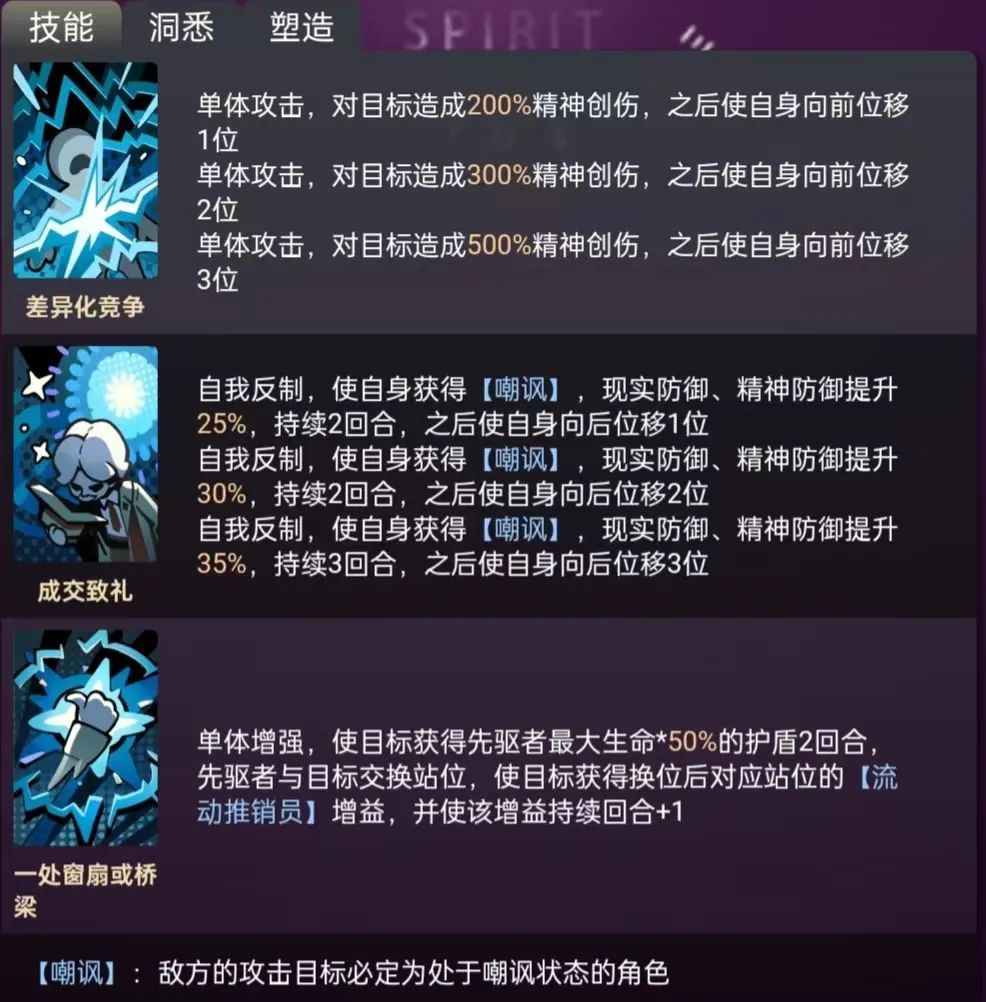先驱者(推荐指数: 1星半) 角色简介 先驱者是一名灵系护盾辅助型角色。他能够根据自身所处的站位,获得不同的强力增益;使用至终的仪式时,能与目标友方交换位置,使目标友方额外获得该站位的增益效果,并赋予高额护盾。 角色评价 先驱者个人强度较低,作为3星,因为面板问题,不是很能抗,唯一有用的地方在位移机制(但现环境没有用处,也许uttu会大放异彩,或者在日后版本需求位移?)。自身大招赋予的单体护盾量