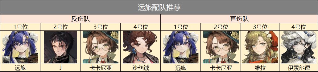 司辰们好呀!在6.25-7.9号期间复刻远旅,那么需不要抽? 直接给结论:无论是新玩家还是老玩家都不推荐抽取!(XP党除外)那么针对已经有远旅的且想培养起来的玩家(包括想拉满的XP玩家),接下来的内容就是关于远旅的培养与组队推荐。 推荐配队: 远旅反伤队——远旅+J+卡卡尼亚+沙丝绒(沙丝绒可以换成其他奶妈) 组成该配队4人均有反伤手段,远旅的坚固+反伤,J的护盾群体反击,卡卡尼亚的承伤本源反伤,