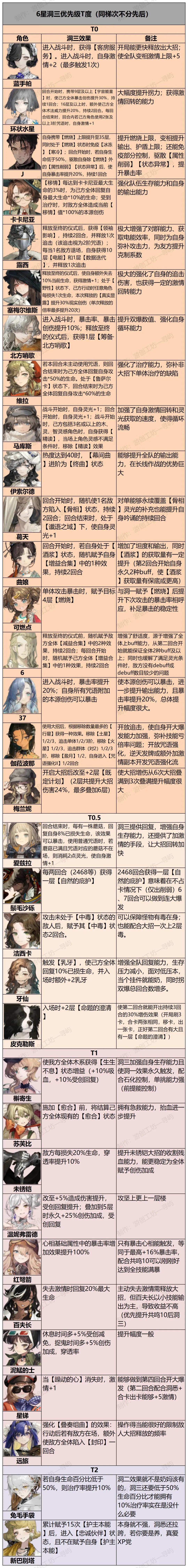 以开服至今在各种场合的表现与对未来保值性进行综合评定。(6星均为0塑、其余均为满塑,同梯次按星级排序) T0: 卡卡尼亚(多功能副C辅助,有挂机能力,能抗能打,还是稀有的攻击拐和记录伤害拐) 维拉(单体拐双爆,精神队最优奶妈) 环状水星 (目前的最强拐位,什么也不做保底收益16%创伤永续覆盖(4人本),放一次buff卡,换来24%创伤+30%爆伤+20%暴击(4人本),拐力已经无人能敌) 露西 (