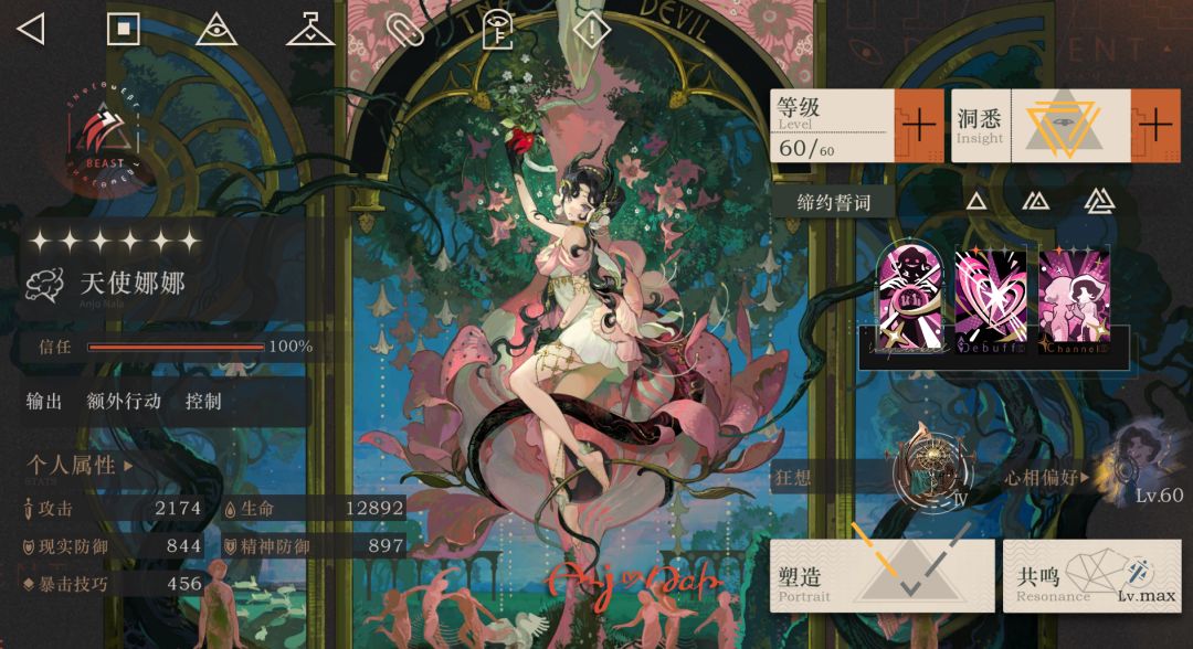 官方定位词条输出、爆发、削弱,相较柏林以东缺少了控制,多出了输出词条。实际在低塑造情况下的最大作用为弥补了精神队伍没有“柏林以东”的问题 【面板】 攻击力和暴击技巧在六星角色中相对偏低,大概是基于传承所以给的大招连发能力做出的平衡,不过相对应生命值较为优秀 【传承】 1:攻击时目标每有1中[属性削弱]状态,造成的伤害提升8%,最高24%;进入战斗时,获得两层[自然的庇护] [自然的庇护]