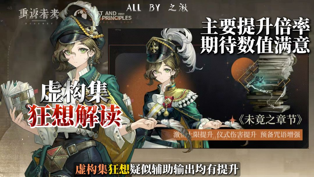 虚构集狂想后至终仪式不再把虚构集自身视为有效目标 通过该方式释放至终的仪式 会使虚构集额外获得更多层数的【独自、群像】 并使虚构集自身激情增加 至终的仪式【下现实主义迷宫】造成现实创伤提升 对主目标额外造成的现实创伤提升 每额外消耗数点激情 本次攻击仪式威力提升 【独白、群像】提升额外造成的现实创伤。 【独白、群像】提升层数上限。 新增效果:释放至终的仪式时 根据【独白、群像】的层数提升造成的伤害