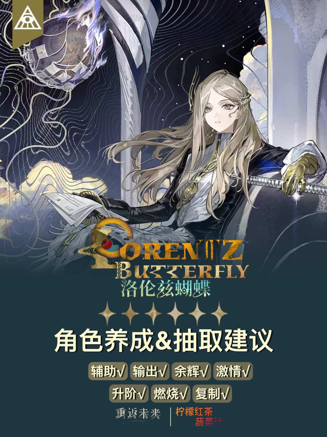 大家好呀! 这次给大家准备的是「洛伦兹蝴蝶」的角色养成&抽取建议。 最后,制作不易,如果喜欢的话不妨点个三连支持一下吧~ 也祝各位司辰欧气爆棚,单抽出金,十连满塑!✨ —————————————————————— ✅如果在内容、美术等方面有任何需要改进的地方,希望大家多多提出来! ✅如有任何意见、想法或者是发现错误,欢迎大家提出来! ✅请大家在评论区友好交流,互帮互助,共同维护良好氛围! ✅请