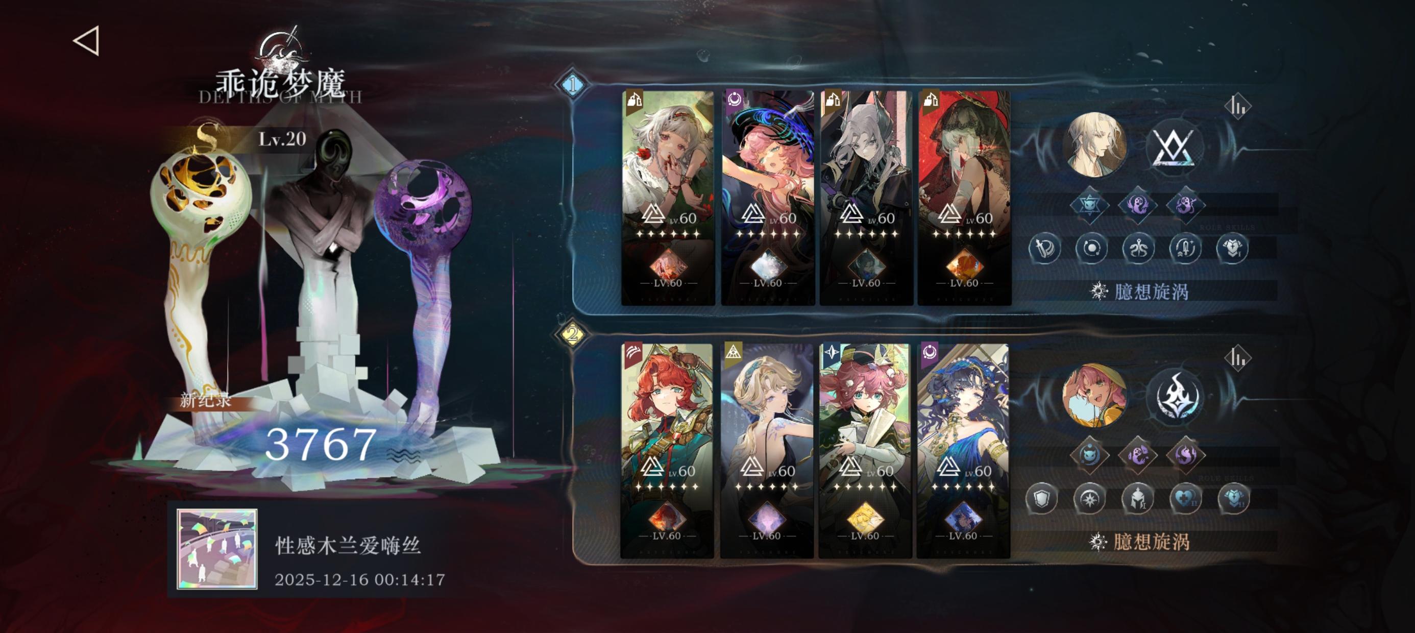 给一些练度和我差不多的宝提供我个人3600拿满雨滴的思路练度:薪血塑造0300,余晖塑造0310,诺谛卡鸭妈满共鸣,其他都是共鸣11 12这样子,应该算标准的中配练度。薪血带老调律(刷牌那个),余晖带新调律(印牌那个)。上半薪血结算分数1700+,下半余晖结算分数2000+(和我练度差不多的话薪血估计极限就是这个分数了,余晖可能还能再高点不过也不好说毕竟再高梦主就得双s级了)环境都默认即可,薪