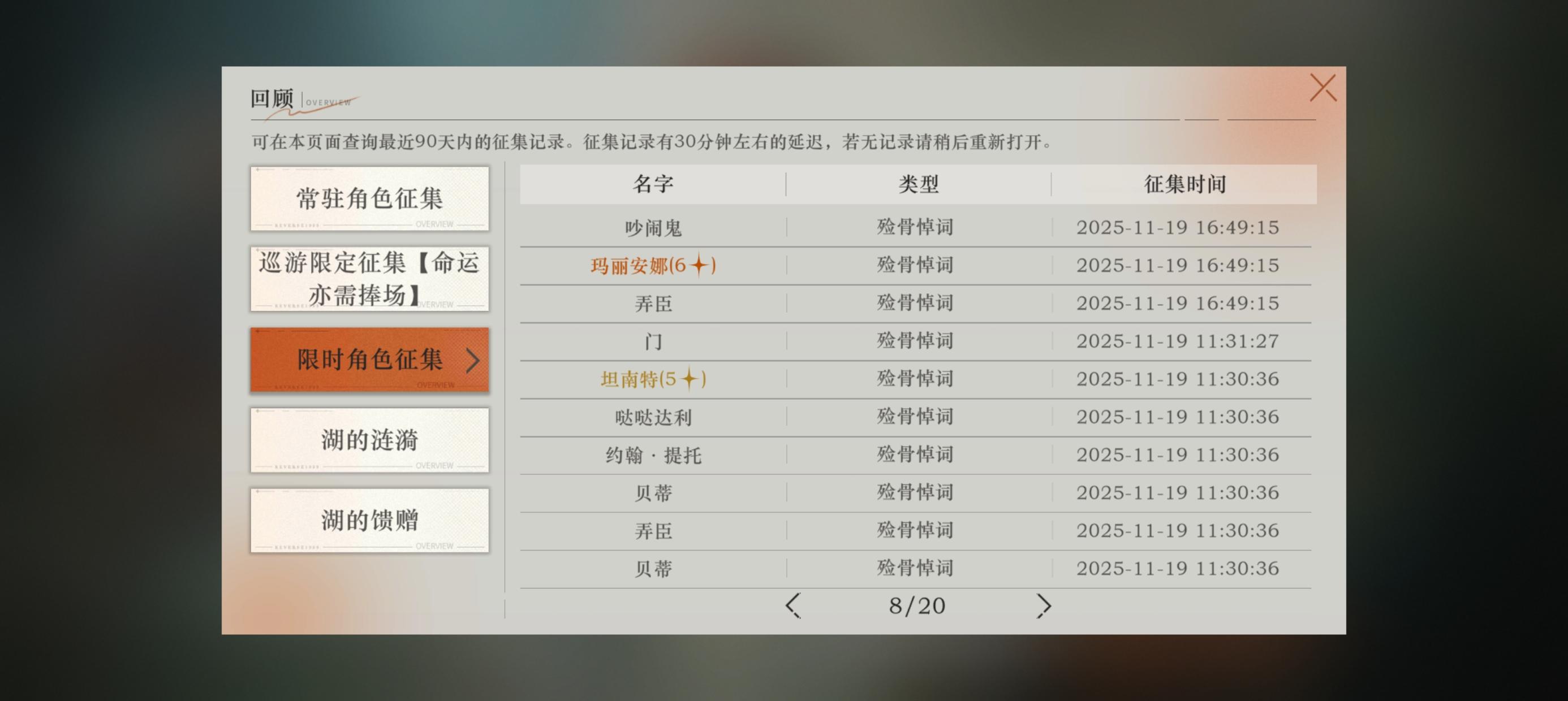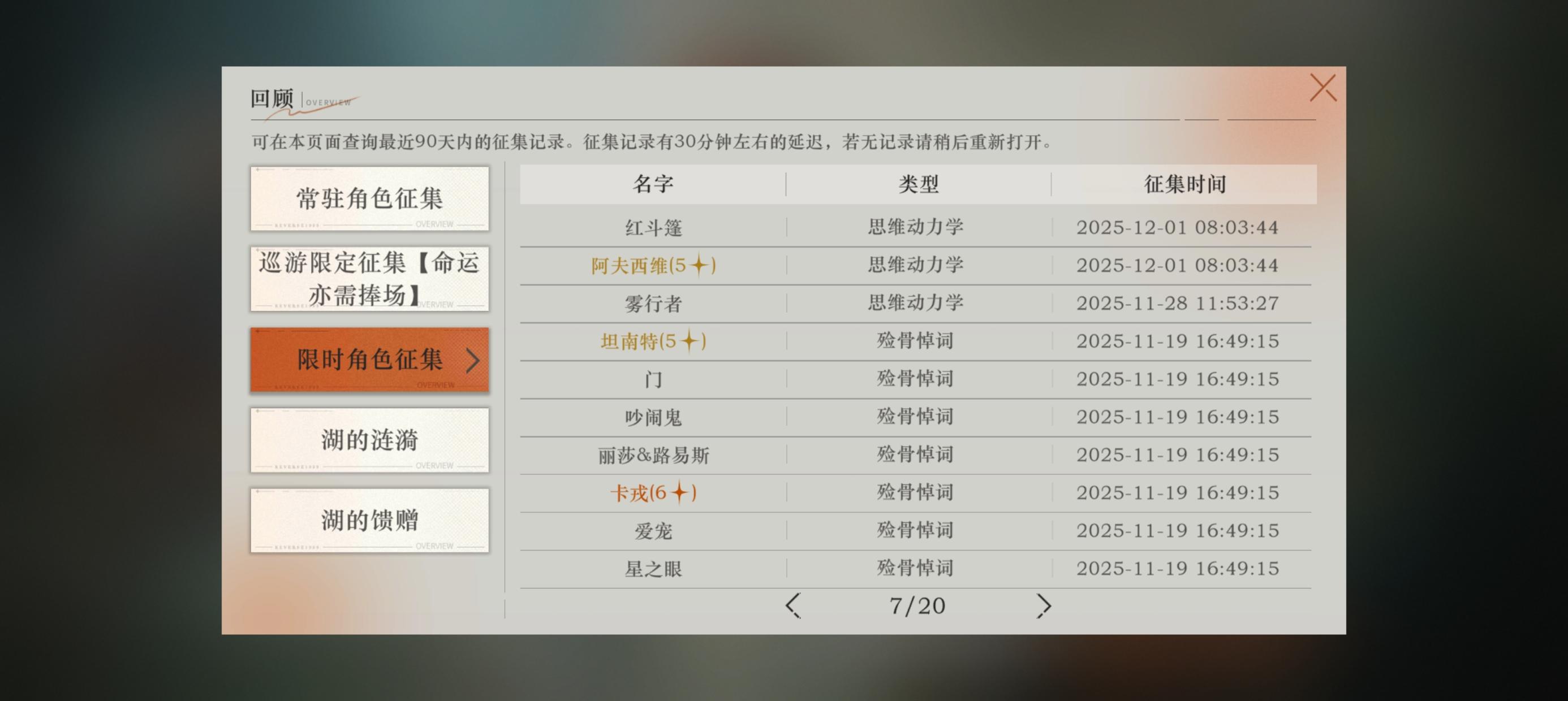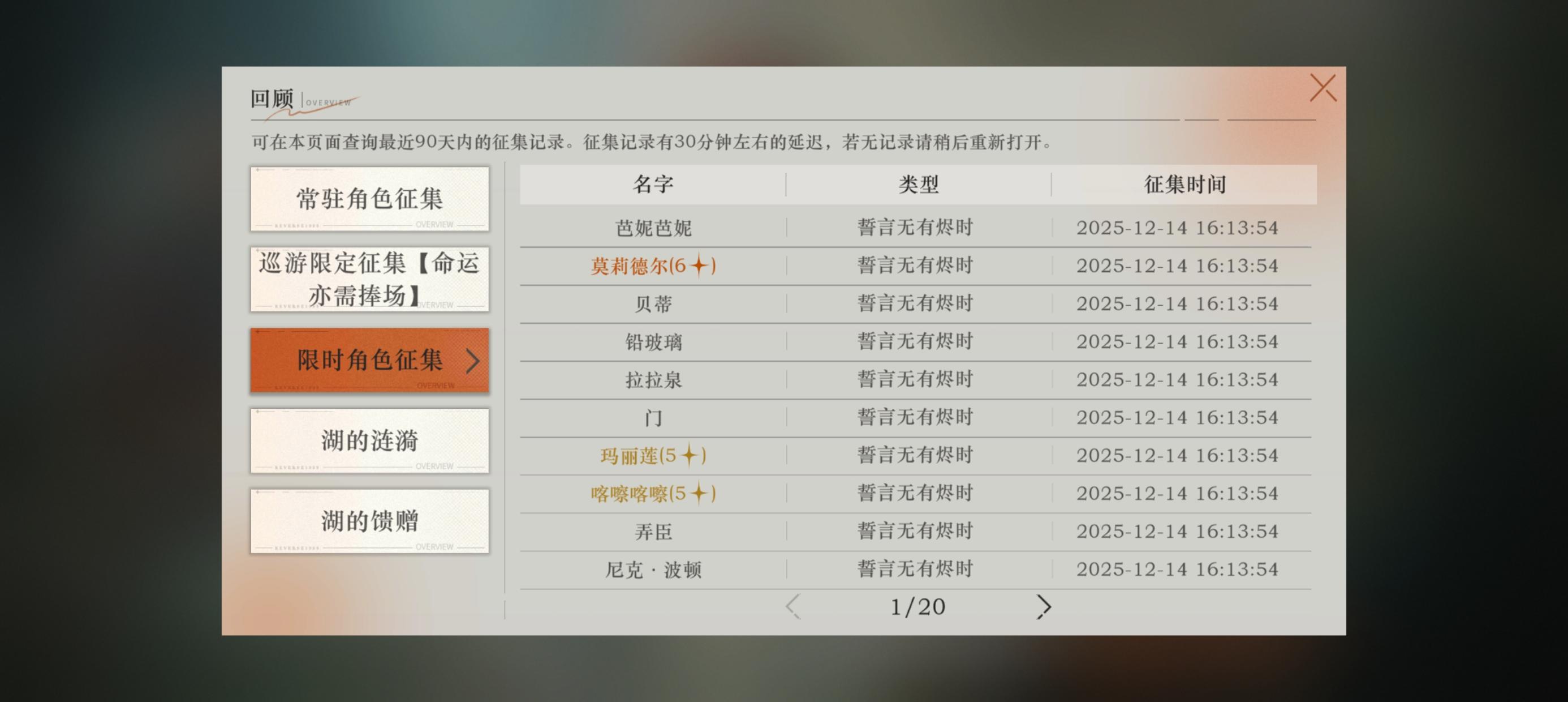 下午在哪一点点看剧情,肝了一发十连,抽玛尔纱又歪了,感觉自己这个号很非,就想着看看有多非,这一统计,好嘛,开服到现在(中间退过一段时间),歪了22次,剩余五星加塑造24个,扣除大保底22次,也就是说我只有2次小保底不歪,我真服了,前不久第一次看见双黄,也是个大保底的,这50%概率歪全给我了是吧#重返未来:1999 #游戏日常 #游戏讨论