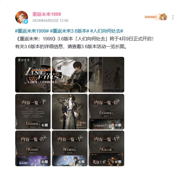 《重返未来:1999》3.6版本「人们向何处去」将于4月9日正式开启!有关3.6版本的详细信息,请查看3.6版本活动一览长图。