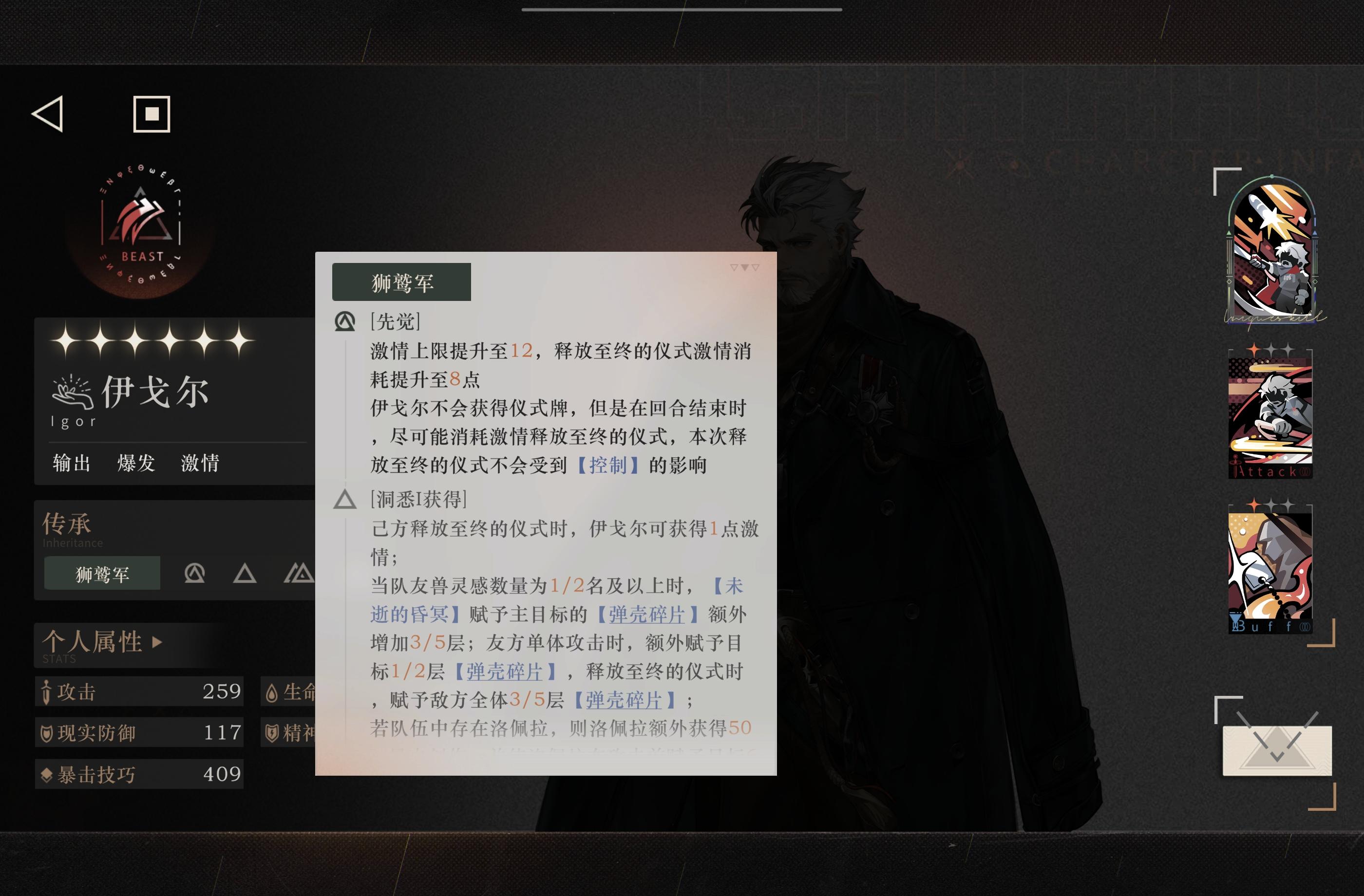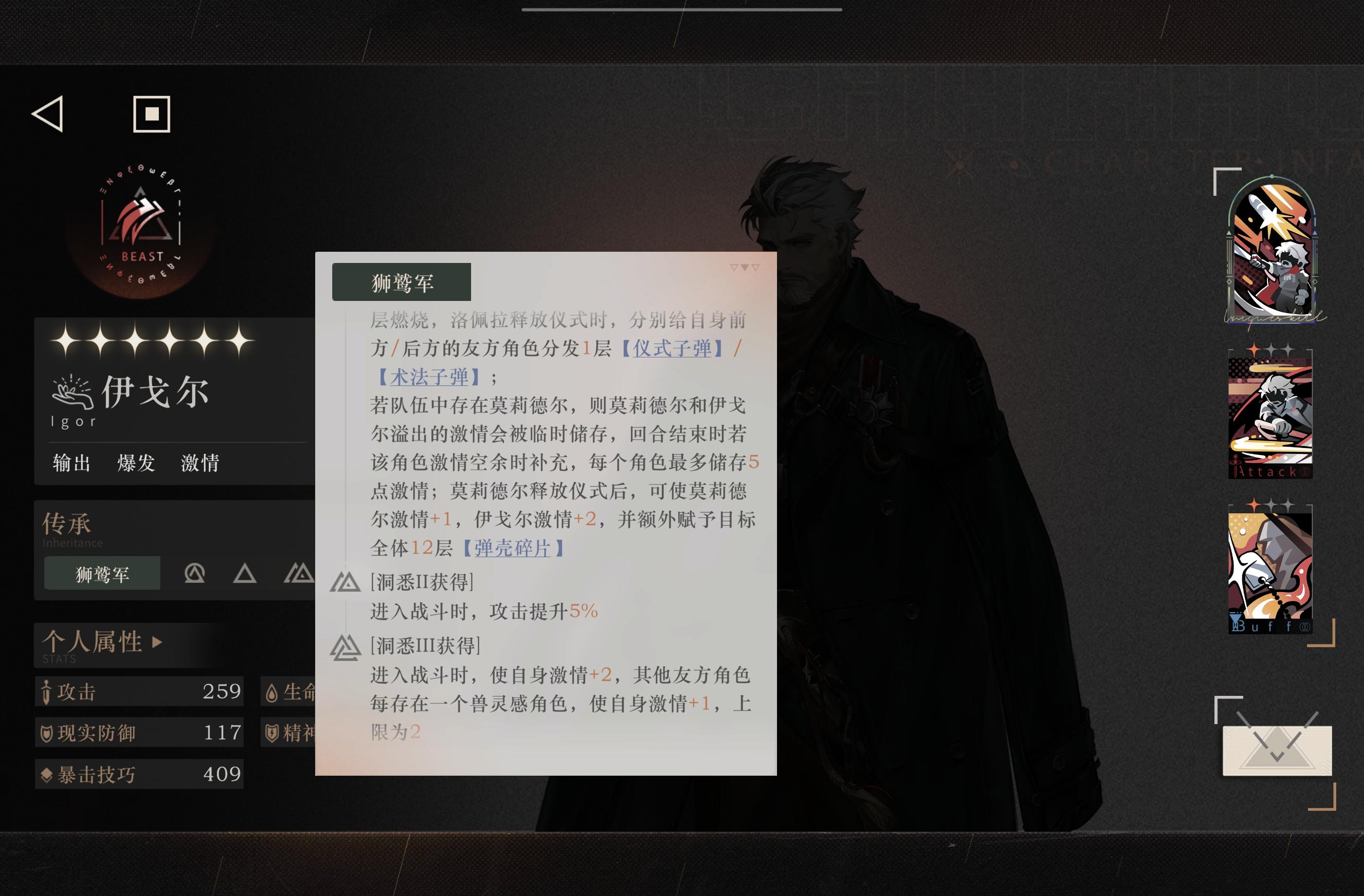 今天伊戈尔技能数值上线咯~随便看看:1.大招倍率=900%群体+900%单体+吃满碎片层数后额外2500%2.队伍有3个兽灵感就能吃满初始4激情,所以生存可以不带兽。8激情才能放大,这样循环的话需要茉莉频繁放大才能攒够将军激情,并且碎片层数也同时需要茉莉大招才能攒得快3.攒满6种子弹有48%额外仪式加成,洛佩拉大招给将军1激情以及回合结束单体攒碎片层数,这样看起来洛佩拉的作用小于茉莉#重
