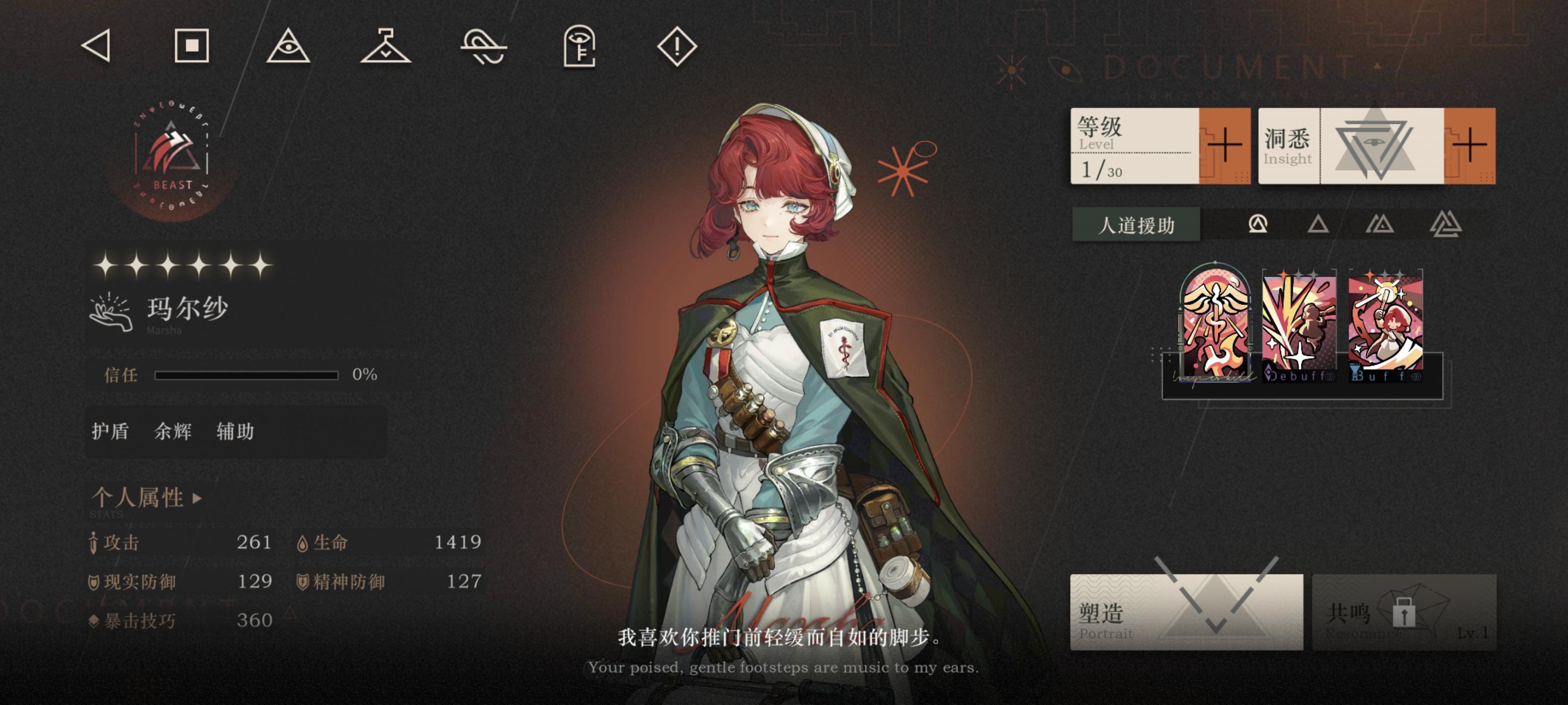 //新秀登场玛尔纱 | Marsha“我们挥舞着战旗,手持长剑,却……从来不是……从来不是为了杀戮而战。”玛尔纱的童年是由严苛的骑士训练构成的。她日复一日地磨炼剑术,对此甘之如饴,毫无怨言。她笃信典籍与教条所描述的骑士荣誉——参战并在战场上获得胜利。但真正踏上战场后,机枪、炮弹和碾碎一切的坦克……她发现生命脆弱得如一张燃烧的纸。她听不见荣誉的呼唤,只能听见来自地狱的深邃悲鸣。战争不会带来荣