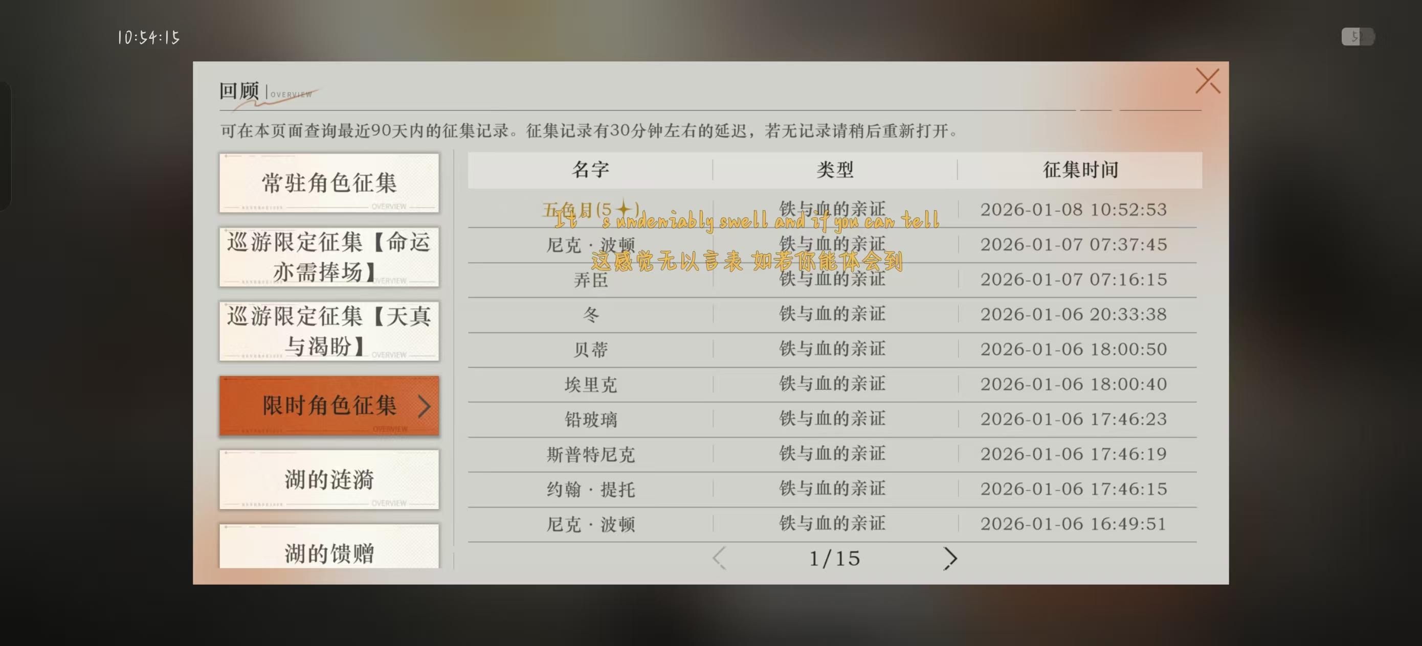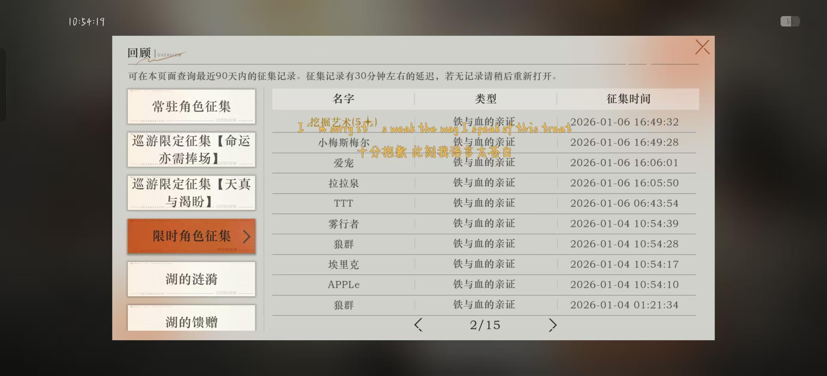 本来不想抽这货的,看到几个朋友都说垫个十连,我就动摇了,想着垫一下吧,出不出都不抽了,剩下的等新春限定,攒雨滴不容易啊。结果垫一下出了,这下不上不下了,我伊戈尔队友只有图图石子,图图还在我电能队打工,除非电能队图图拿出来换我的维拉,就算拿出来,我还差莫里德尔和洛佩拉啊!现在两个选择要么放着不管当开图鉴收集新up了,留着雨滴抽新春限定。要么就下莫里德尔池子,抽出来莫里德尔三等一,等一个不知道什么时