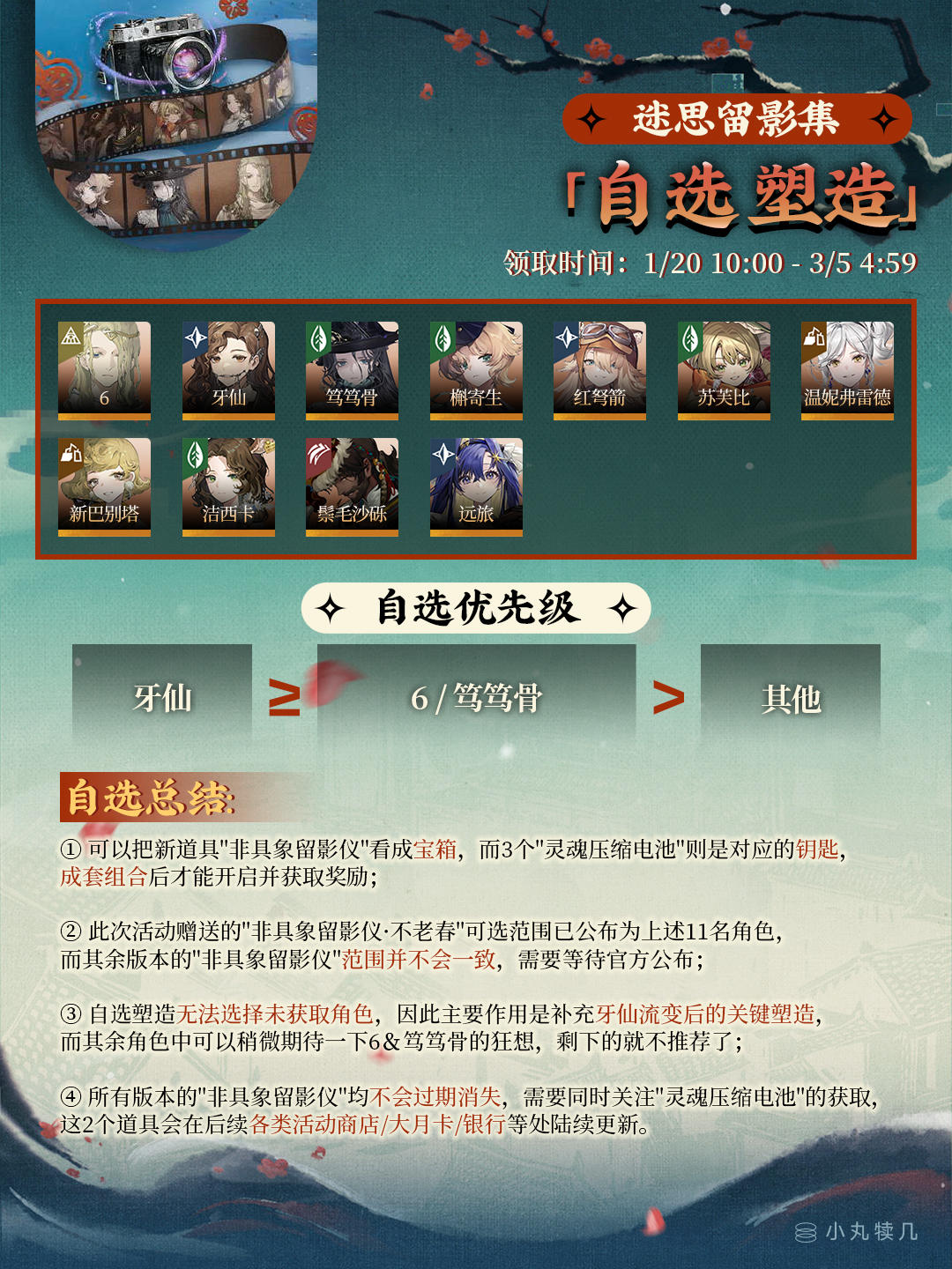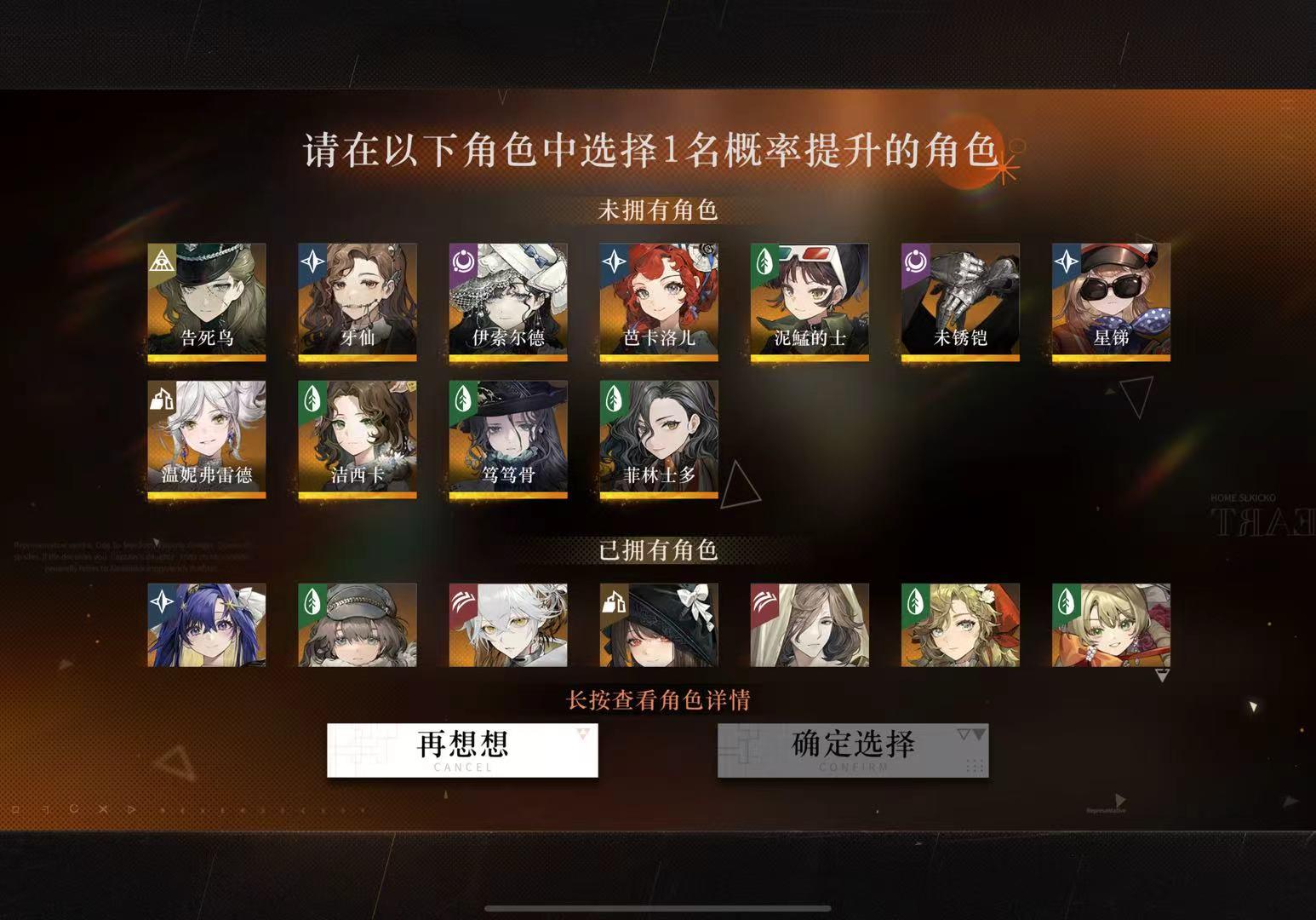 ▶▶征集说明◀◀※玩家可以在指定的角色范围内自主选择并锁定1位六星角色作为概率提升的角色。▶▶自选范围◀◀泥鯭的士、远旅、星锑、牙仙、芭卡洛儿、伊索尔德、温妮弗雷德、塞梅尔维斯、兔毛手袋、马库斯、葛天、维拉、苏芙比、阿尔古斯、洁西卡、笃笃骨、菲林士多、未锈铠、告死鸟————————————————————————————首先,这个叫概率提升,不是必出,也就是说你即便想要8k或