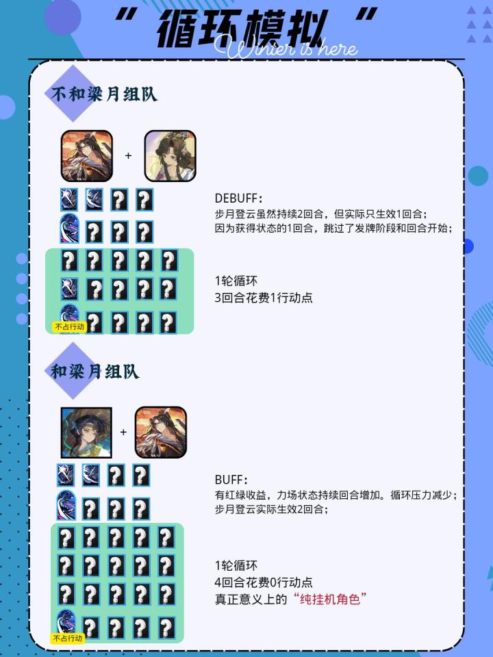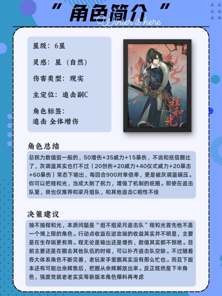 作为追击副C拐,程和光与梁月的相性较好,但只建议想玩梁程队的玩家抽取(XP除外)。首先程和光的刷牌机制为纯随机,经常刷不到梁月的牌。其次程和光并不能像纸信圈儿一样在各个额外行动队发光发热,仅在梁月队优先级较高。塑造方面:塑造建议抽取0/1/2。1/2塑关键塑造提升较大,主要是增加辅助能力和并极大优化手感。3/4/5塑都为提升程和光自身输出,作为主C输出仍旧不足,不是很有必要。配队方面:狂想梁月