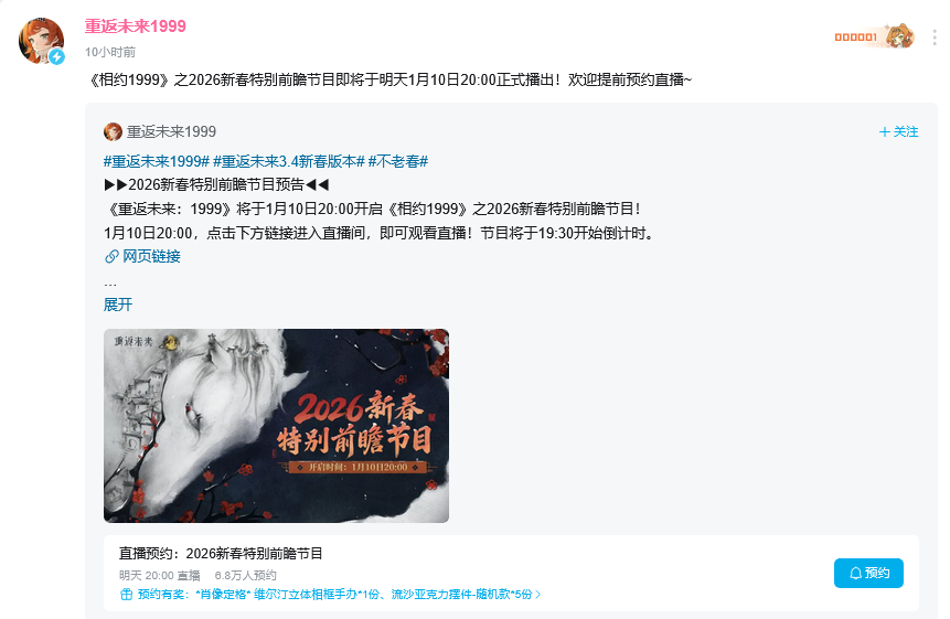 💧139:还有近7万死忠玩家!哈哈大的又又又出现了家人们!广州深蓝互动网络科技有限公司开发的策略卡牌类游戏《重返未来:1999》于近日更新了《相约1999》之2026新春特别前瞻节目的预约人数根据平台上的信息显示,此次2026新春特别前瞻节目 的预约人数高达近七万人次!这一数据说明《重返未来:1999》运营到现在,愿意第一时间获取相关信息的游戏核心玩家还有近七万人次!目前关于此次新春特别前瞻