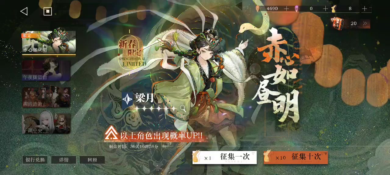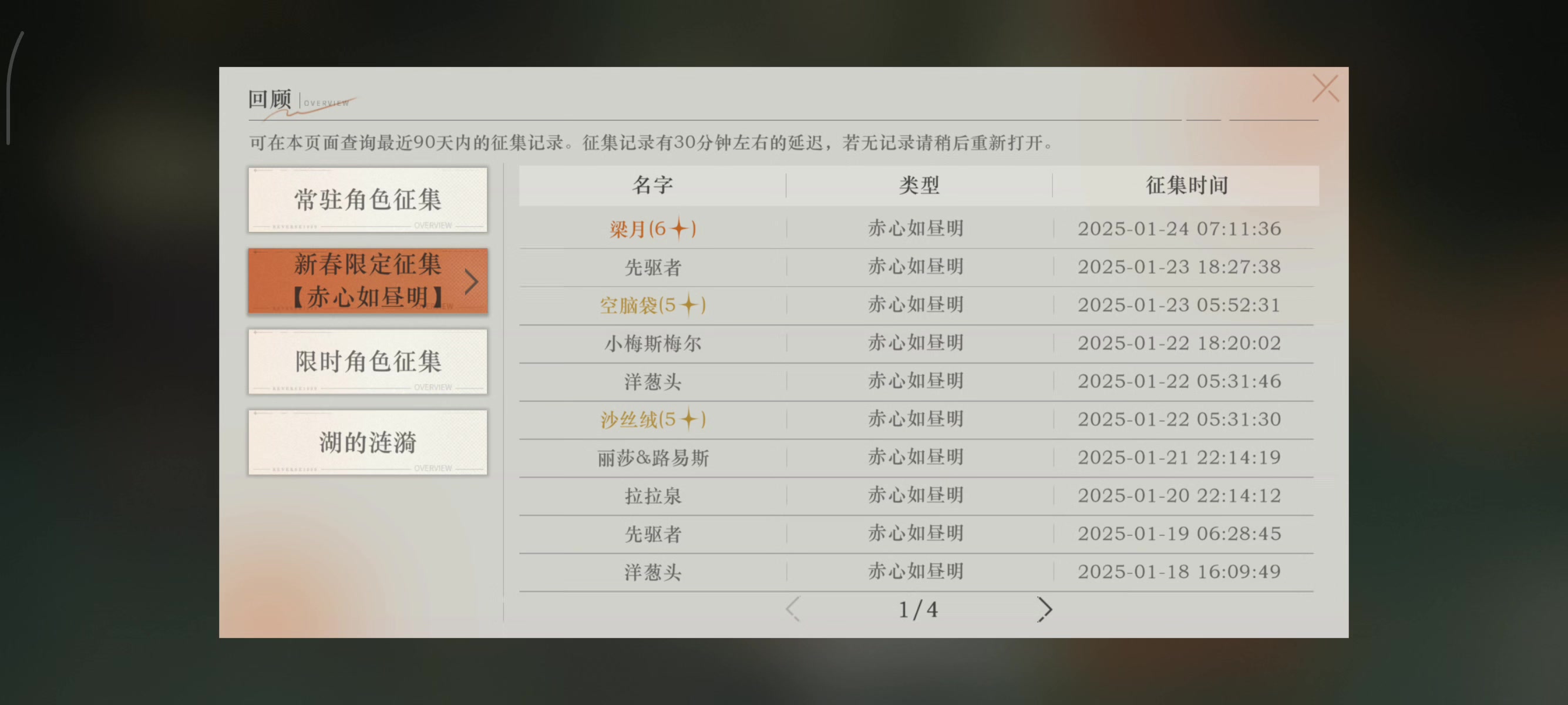上线送的10连就抽到梁月,感恩的心[表情_大笑] 这次剧情也写得挺好的,稳定发挥 虽然还不太会用新角色,但限定嘛,直接等级和共鸣拉满了 累计登录那个活动送6星,半天才在仓库找到券,出了个new,但爱兹拉[表情_微笑]不嘻嘻了 这次皮肤是真的好看,曲娘苏芙比蓝手帕北方哨歌弄臣的国风都很赞, 送了5折券,前4只皮肤已拿下,哨歌皮肤是送的,等uttu拿弄臣[表情_酷] 箱中新背景好看,也买了,但你就不能