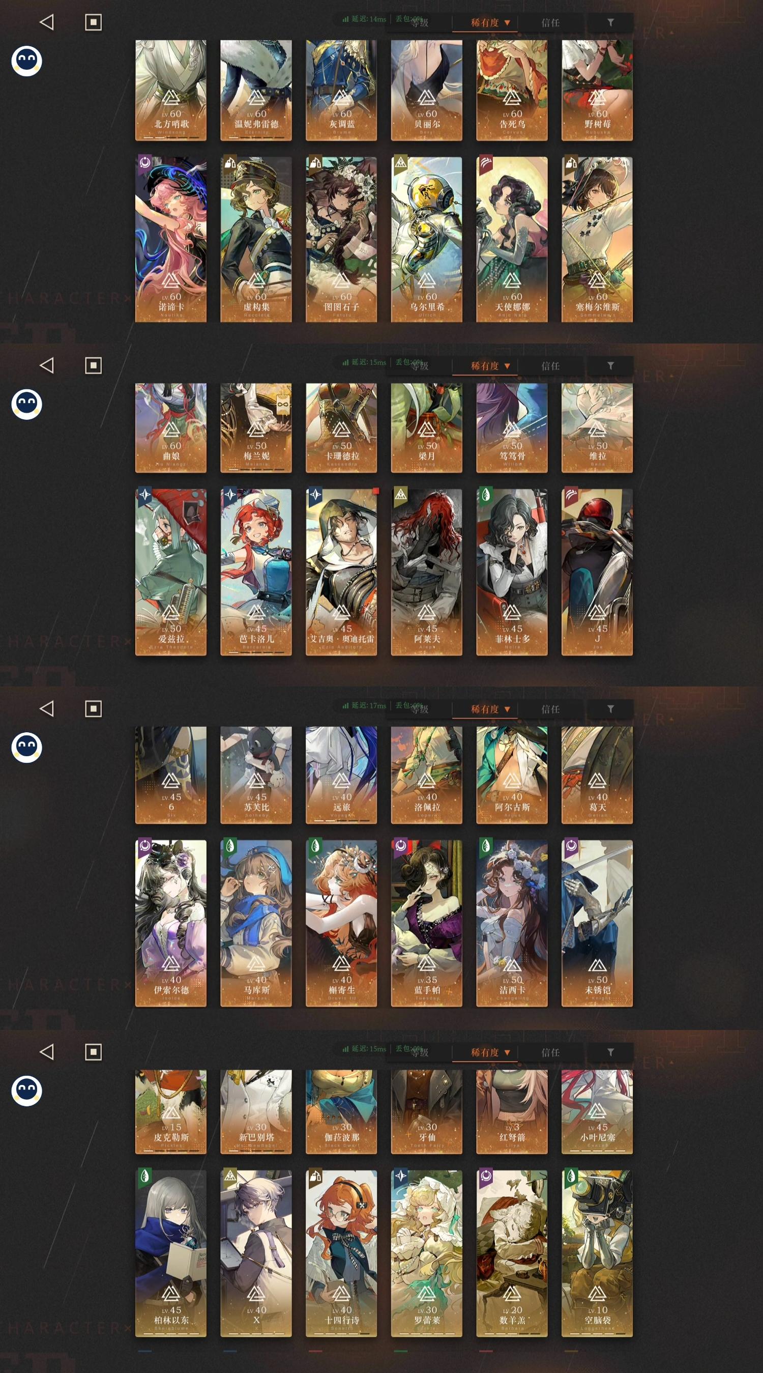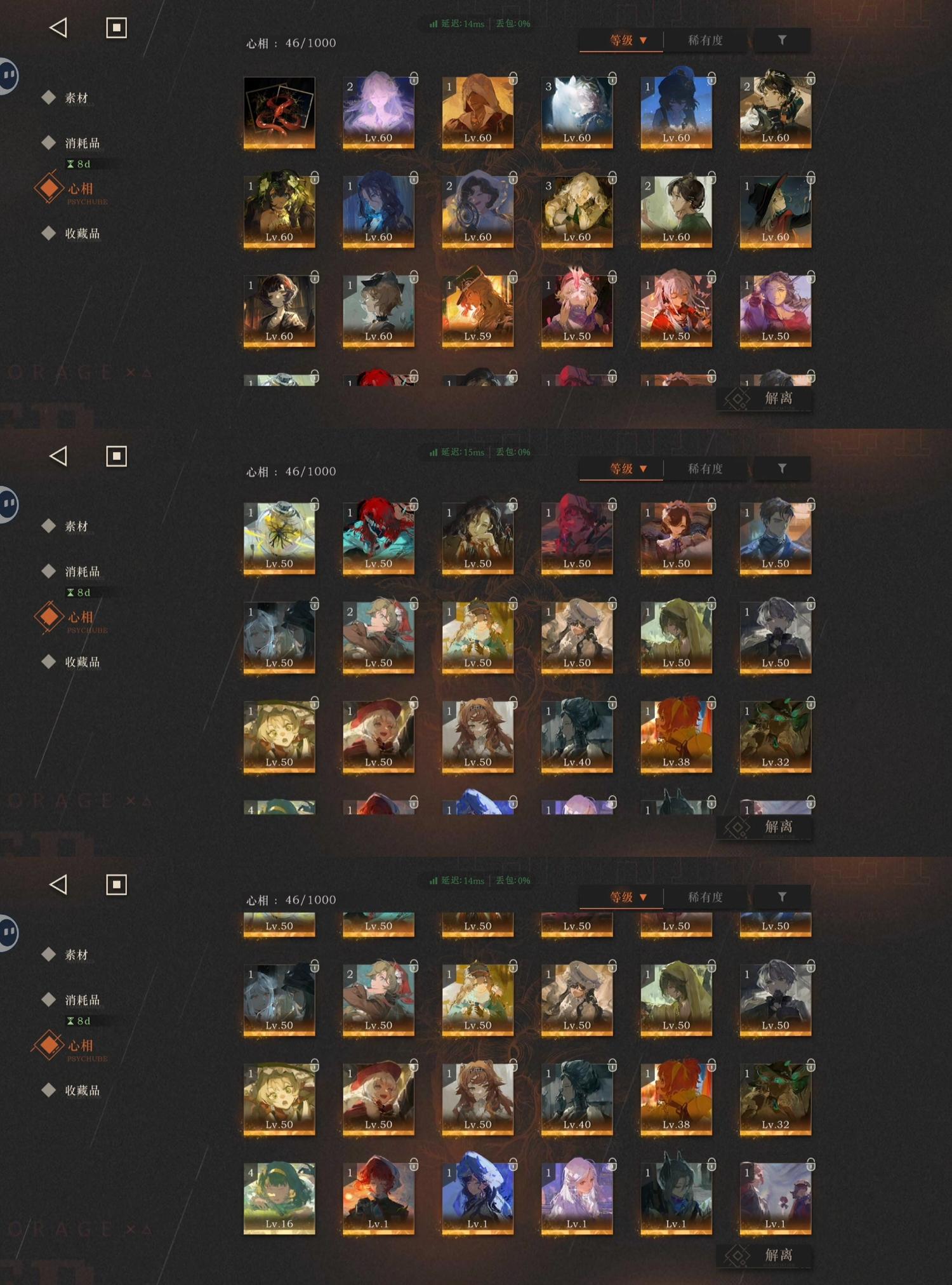 限定角色除了露西都有,两个联动角色都有,算半开服账号吧6月3号注册的,六星心相有41个六星角色收藏度是68%