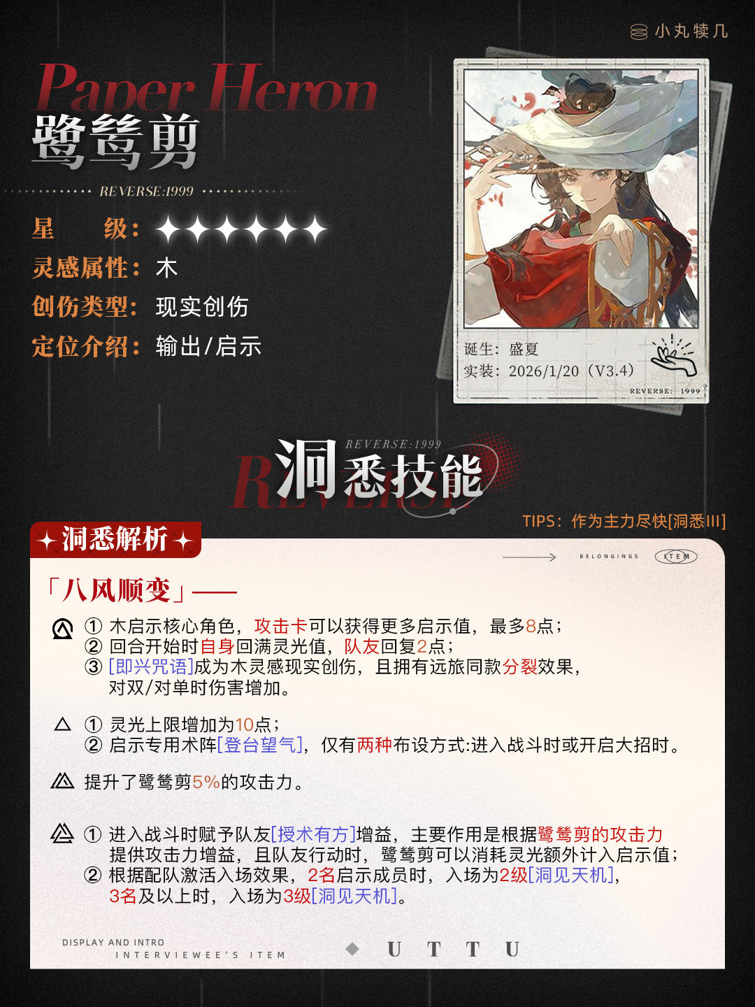#重返未来2026新春特别版本 #游戏种草计划 #重返未来:1999 #重返未来1999 #重返未来1999攻略 Oi~这里是小丸!本期带来的是【重返未来1999】3.4新春版本的限定角色~▶▶角色:『鹭鸶剪 | Paper Heron』星级:☆☆☆☆☆☆灵感:木创伤:现实创伤定位:输出/启示▶▶【共鸣频段】※共鸣10&15通用『最高攻击』摆法:AzwAPBA0IDQiOkA5