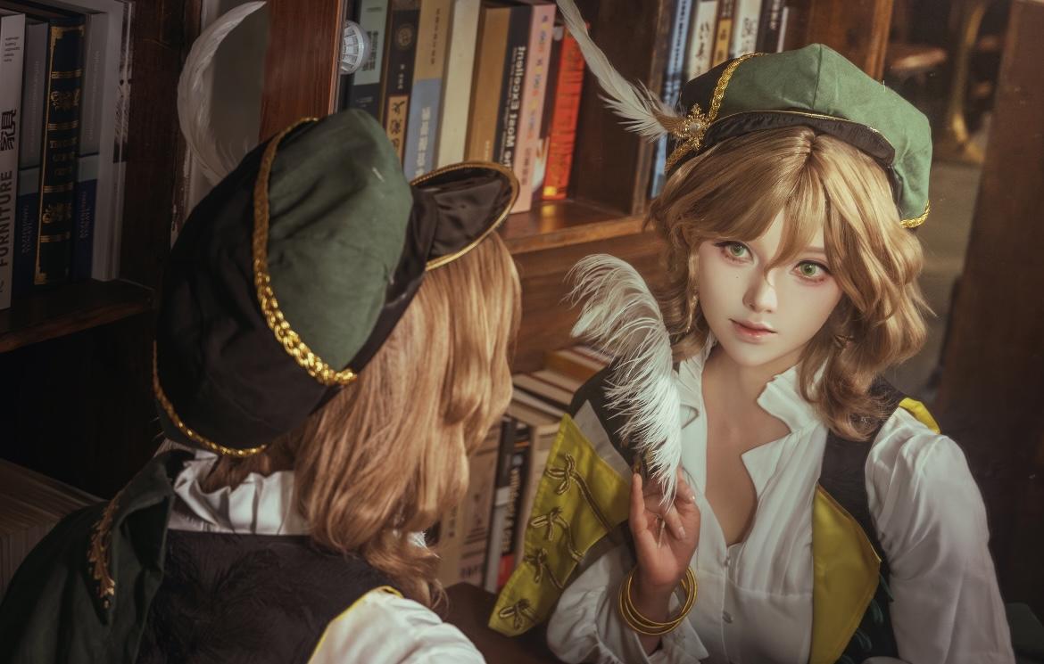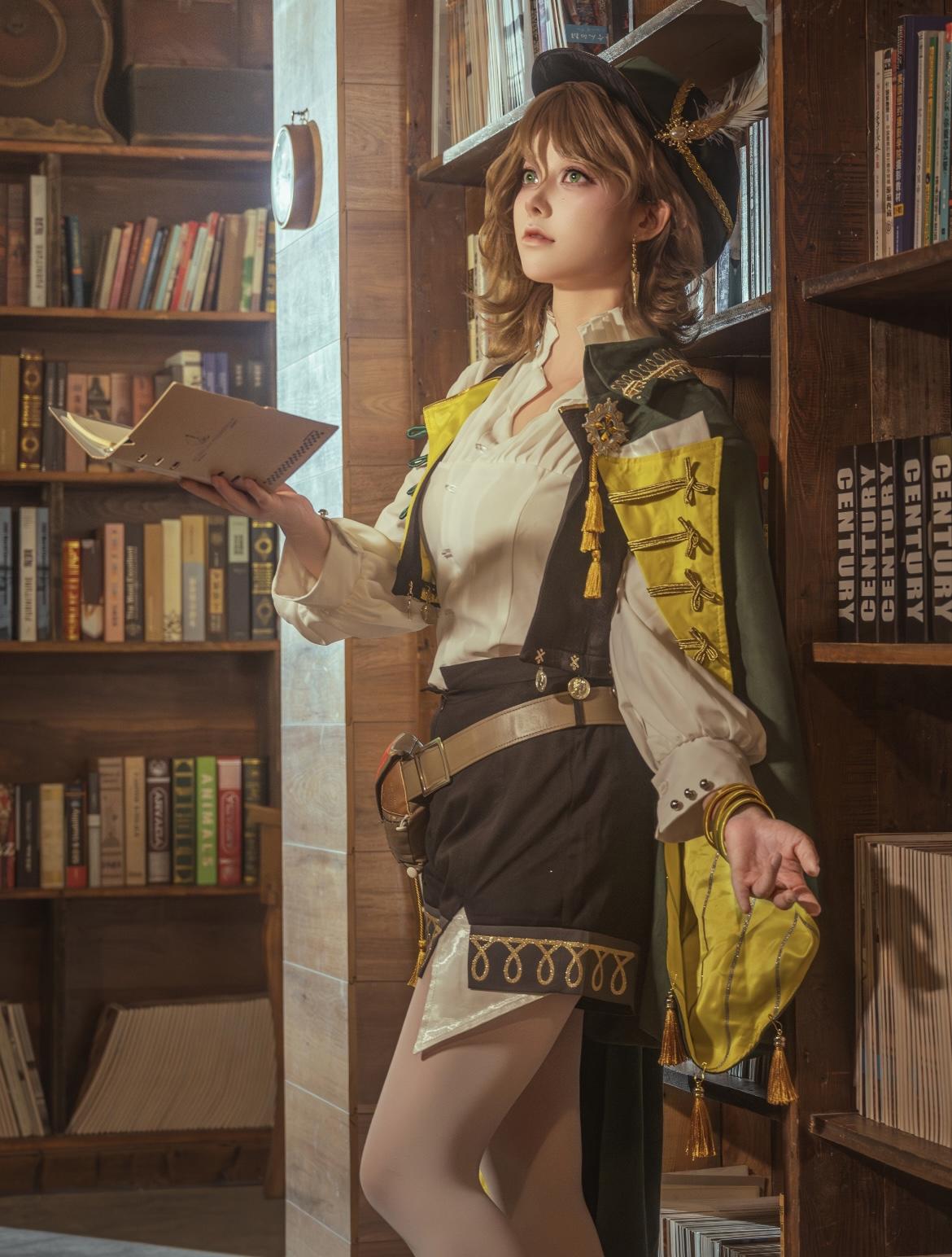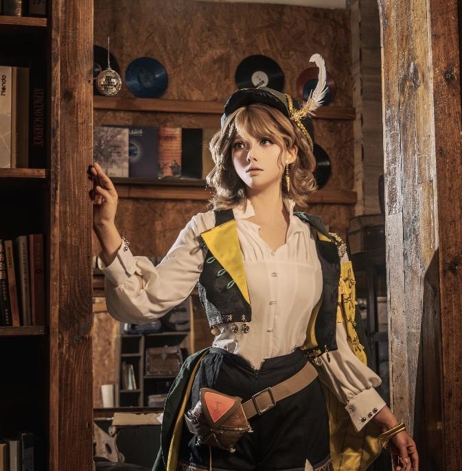 这组cos充满复古书卷气,暖调书店背景里,少女手持旧书的姿态优雅又专注。米白衬衫外搭黄绿撞色马甲,金色流苏与刺绣花纹精致考究,黑色短裤搭配浅灰丝袜,既保留了中世纪冒险者的利落,又添了几分文艺少女的温柔。复古礼帽上的羽毛随动作轻晃,耳间金色耳坠与腰间皮带的金属扣相互呼应,每一处配饰都在诉说着角色的旅途故事。她抬眼望向窗外的神情里,藏着对未知世界的好奇与探索欲。#重返未来2026新春特别版本