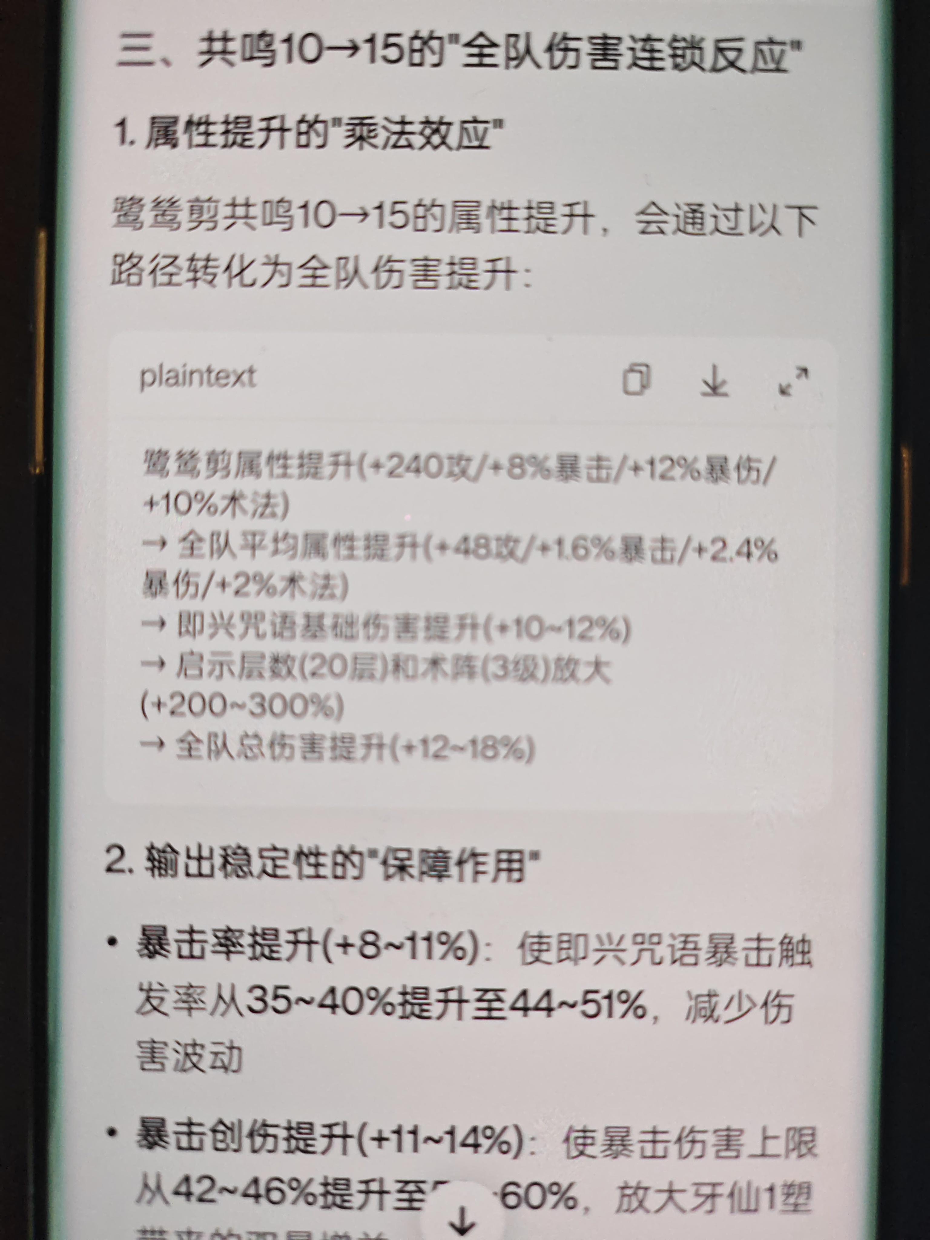 我知道启示队是全队平均值,但鹭鸶剪抽满塑了,就共鸣是10看着好别扭,升15几乎要燃尽材料,就想知道升15提升大概是多少,鹭鸶剪的15攻击提升200多,通过天赋是不是提升还可以,无奈问的豆包,说是有18%的提升,感觉不靠谱,哪位大神给解答下,只升鹭鸶剪共鸣15大概提升多少,有哪些收益,其他没满命没塑造没材料,全升15简直是开玩笑另外攻略都说鹭鸶剪专武增幅收益低,我饕餮多,5%我也升满
