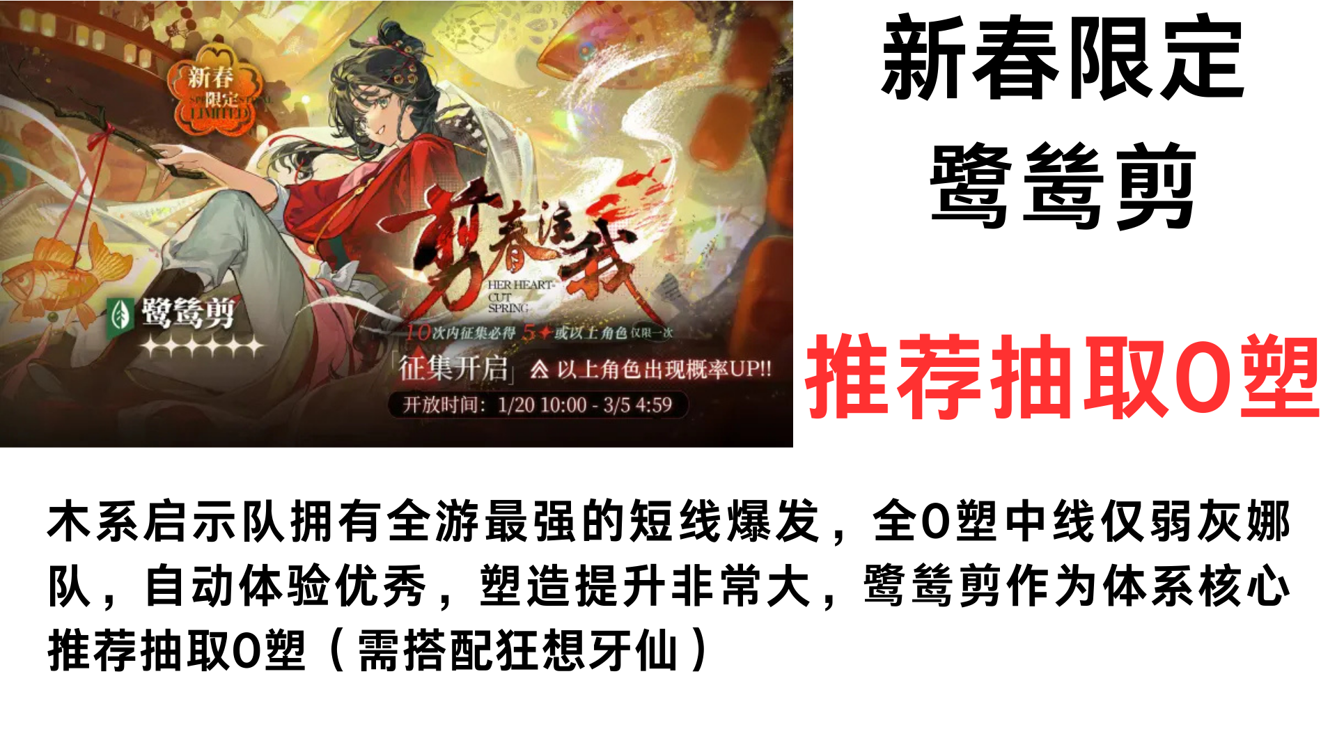 📢 重要提醒兑换码赶快用:1、鹭鸶剪剪纸课堂开课啦2、小程巡检巡检中3、1月20日新春特别版本上线4、魔精主包出道了🆕 新内容一览🎭 新角色 & 狂想系统新角色:鹭鸶剪(木系):启示/术阵定位,群体增伤型输出程和光(星系):追击/仪式体系,可连续行动芦草结(木系4星):生存辅助,群体增减伤狂想系统更新:梁月:追击体系增强牙仙:启示伤害复制6:DEBUFF效率提升+增伤