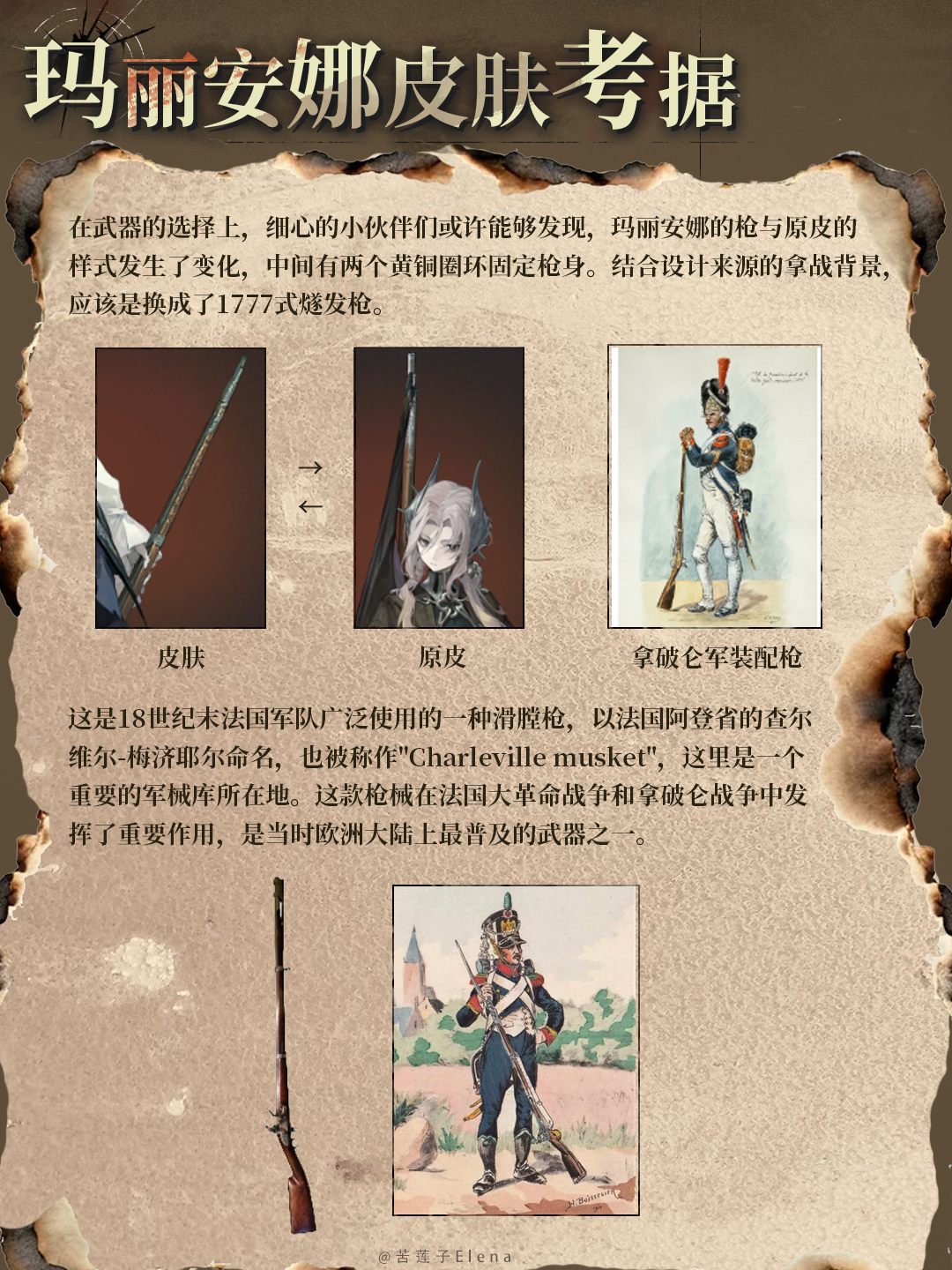 拿破仑军装与十八世纪男士流行的融合。1777式燧发火枪的配置 欢迎收看本期的玛丽安娜皮肤设计考据!大家有买玛丽的皮肤嘛?喜欢本期考据可以点赞关注支持一下!祝大家抽卡十连双金~我们下期再见~#重返未来1999 #重返未来1999攻略 #重返未来远征记 #玛丽安娜 #重返未来玛丽安娜 #重返未来1999考据