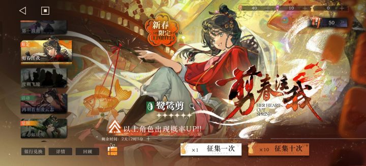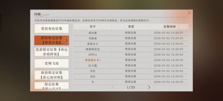 附带抽卡记录在这里楼主我有点懵啊,本人24年的时候入坑,中间断断续续玩着,去年6月份毕业之后有时间玩,就把她当做一个副游来玩,深蓝对我们老玩家真的太好了,当时随便一抽,爆率真的高不过今天到底是怎么了?新春版本,过的好痛苦,连续抽一个月了,中间想过放弃,但是之后想了,我抽都抽了,实在不行我抽个保底换一张也算圆梦了,所幸几天前刚好抽出来了,然后想了想,我还有小程没抽深蓝,保佑我2