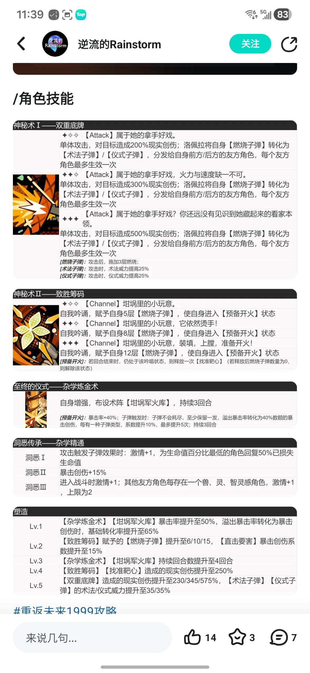 ⭐省流:🎈狂想后质变,兼具高额输出与强力辅助,0塑机制完整,5塑输出再升级1. 技能全面:核心技能叠层上限1000%创伤,仪式AOE+群驱散,辅助技能buff全队暴击率2. 队伍适配广:升阶队、梁月队核心,启示队4号位优质替代3. 心相有明确梯度:首选五星专武,次选过渡款,部分心相可跨角色复用4. 培养性价比高:高塑优先级拉满,低塑也能适配多体系,养成压力小 一、技能与狂想强化解析#今天游戏圈发生了啥