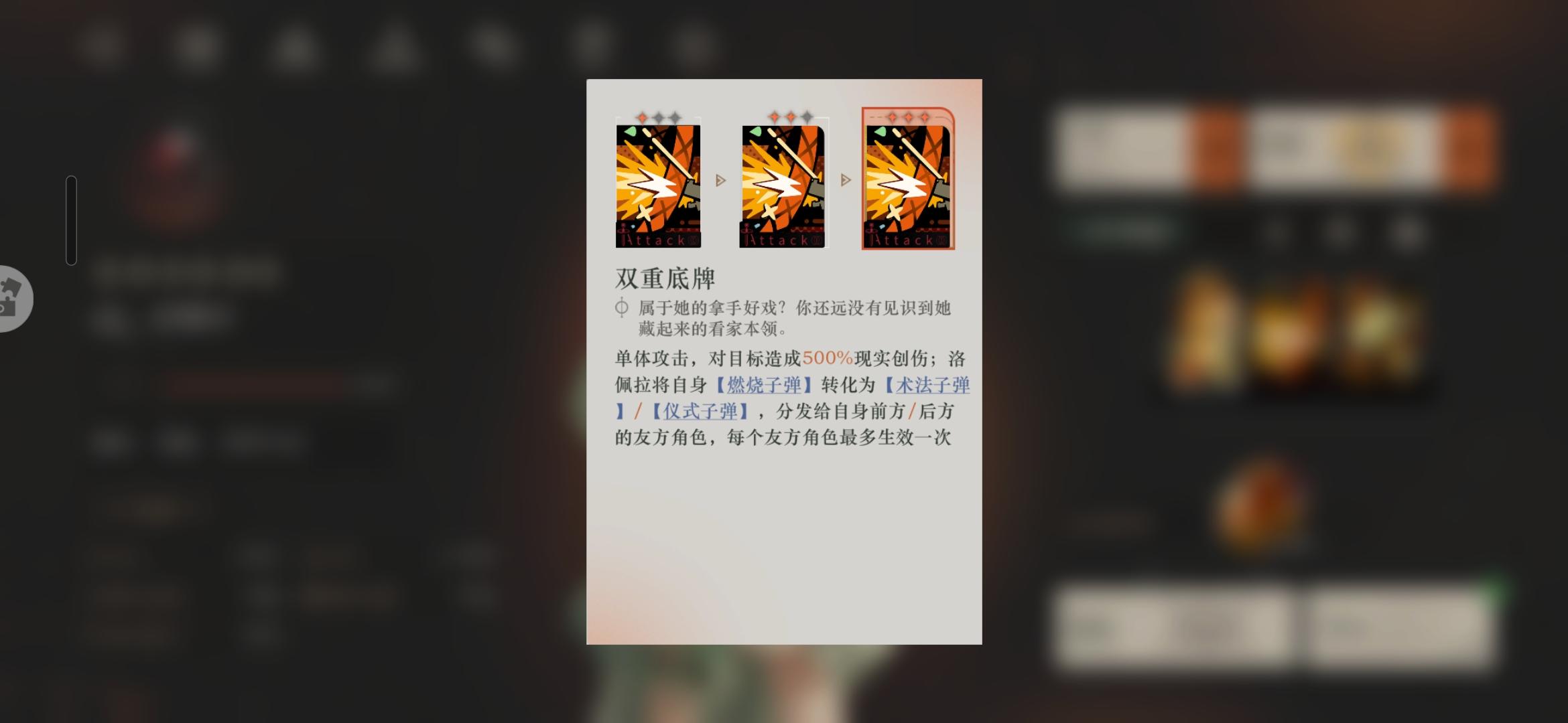 与洛佩拉,洛佩拉仪式时分发子弹。增加洛佩拉爆伤。攻击前赋予燃烧。1️⃣仪式也能发子弹,节约了洛佩拉第二回合攻击卡分发子弹的行动点。在战斗早期启动阶段节约下的行动点对队伍整体牌权分配很有用。2️⃣增加洛佩拉爆伤,相当于增加洛佩拉爆伤转爆伤的辅助能力。3️⃣攻击前赋予燃烧,降低了找准靶心触发直击要害效果需要20层燃烧的门槛。洛佩拉对伊戈尔无直接影响。