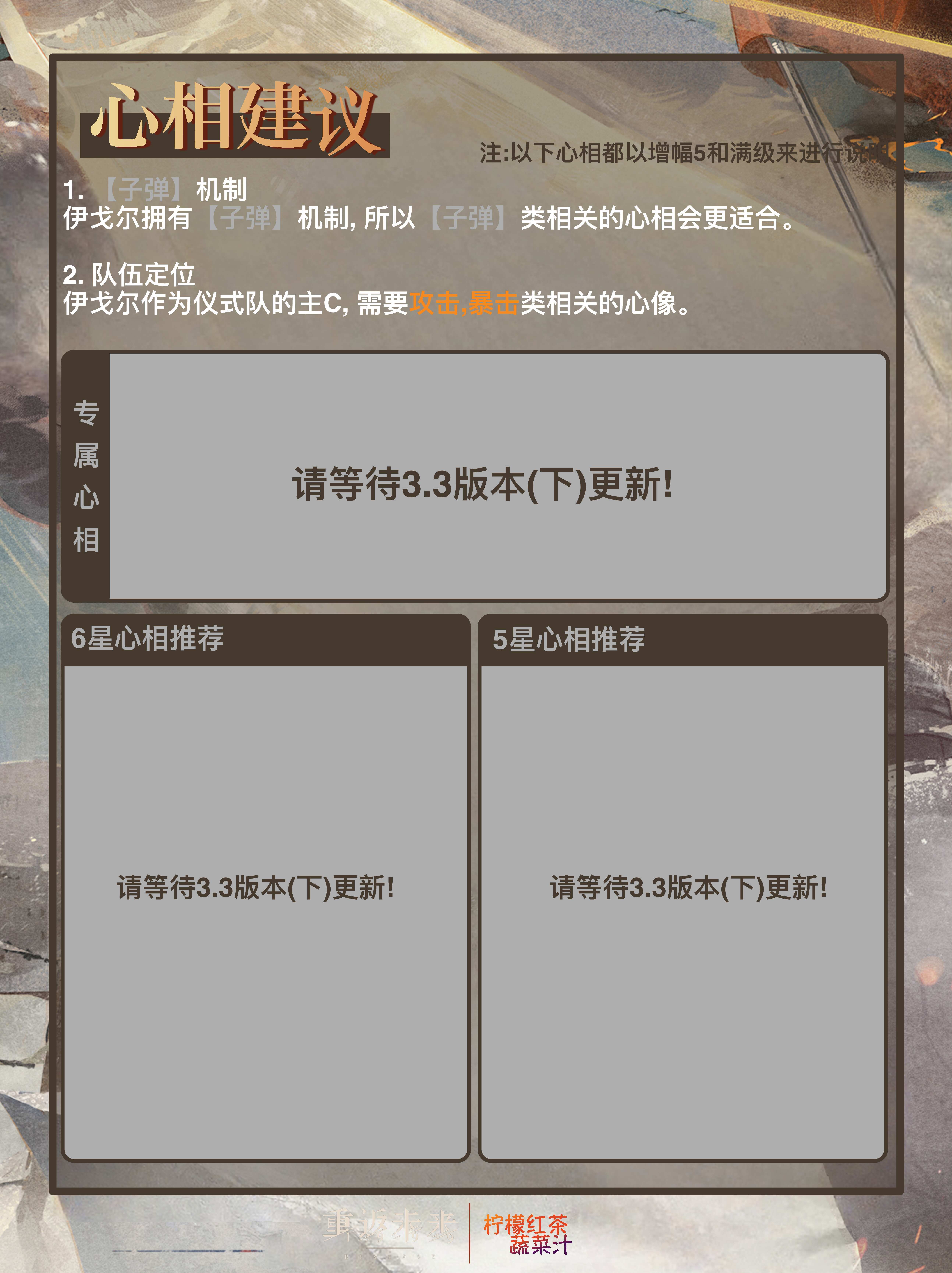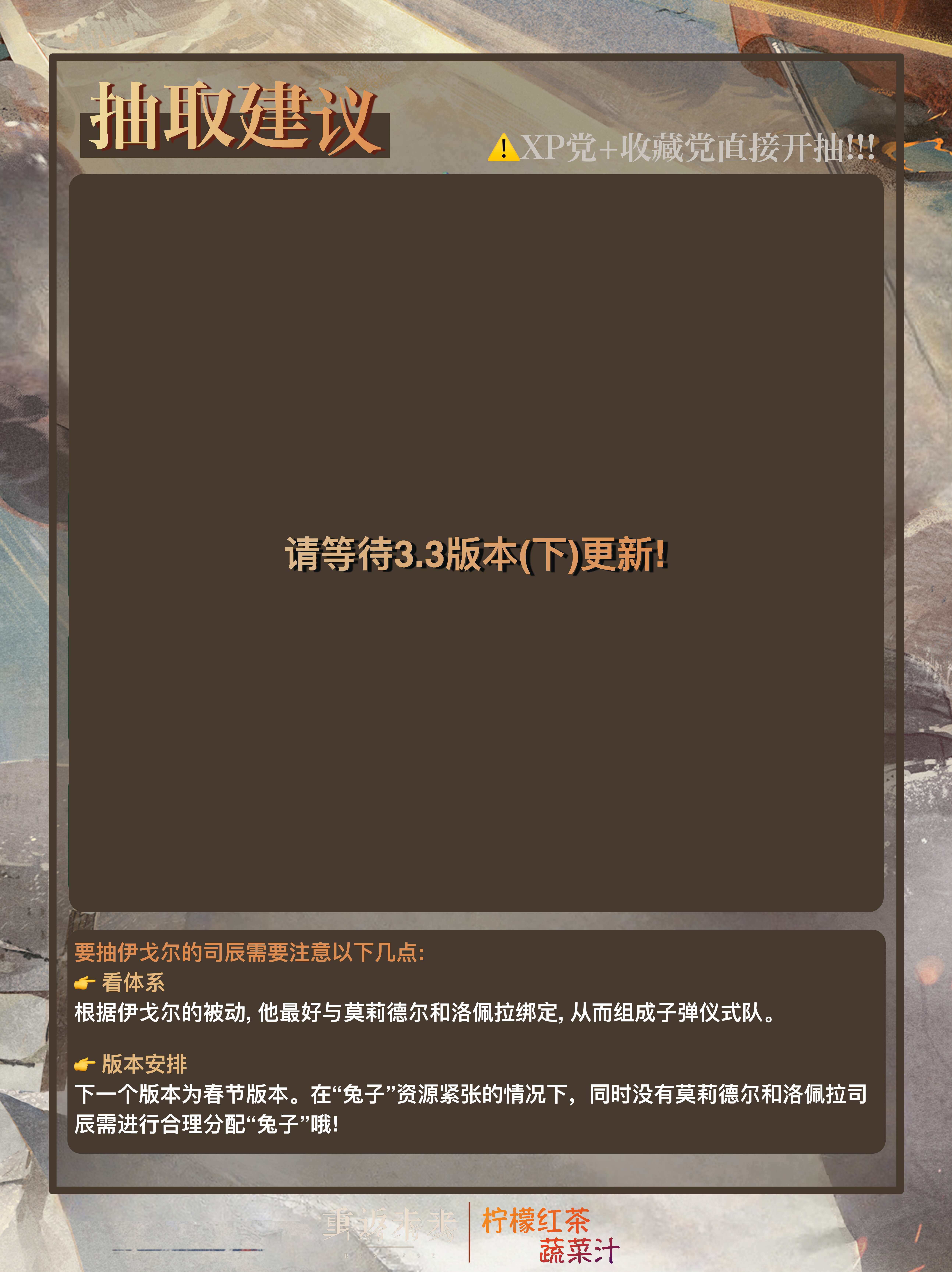 大家好呀!这次给大家准备的是「伊戈尔」的角色养成&抽取建议。由于部分内容官方并未公布,笔记中如抽取建议、塑造建议、养成材料等并未写上去。等3.3版本(下)正式上线的时候,我会尽快补充完整。在此期间,请各位耐心等待⏰,大家可以提前刷取微尘和利齿子儿。最后,制作不易,如果喜欢的话不妨点个三连支持一下吧~也祝各位司辰欧气爆棚,单抽出金,十连满塑!✨————————————————————